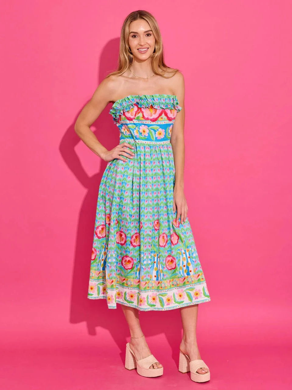 Whether it's a wedding or a weekend getaway, The Catherine in Chateau is the perfect choice, keeping you comfortable while looking oh so cute! This strapless dress features a ruffle bodice detail and midi length.