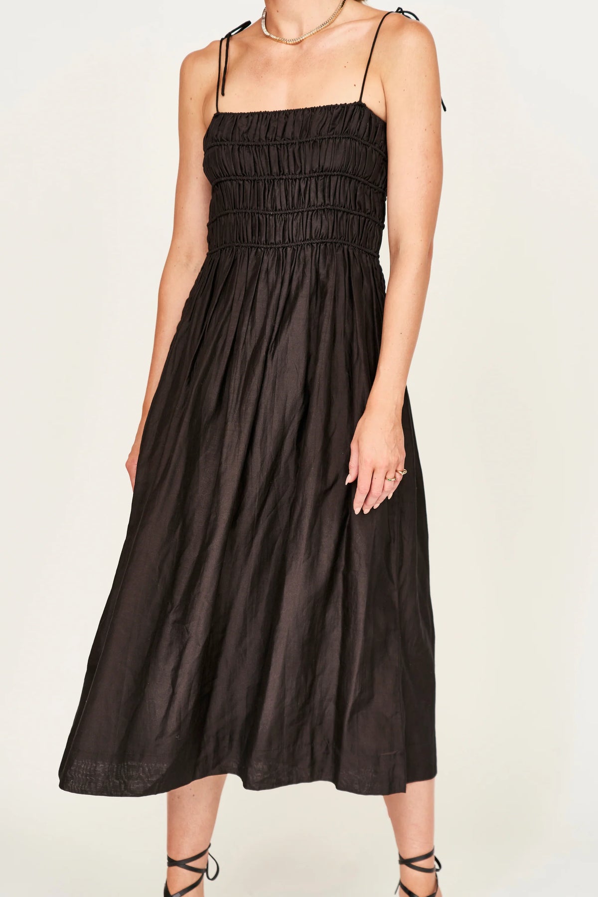 The Puglia Dress in Black is perfect for any occasion with its ankle length and smocked elastic bodice for a comfortable fit. The spaghetti tie straps with beaded detail add a touch of elegance and can be tied in multiple ways. Made with a soft and light cotton/silk fabric and fully lined for a luxurious feel. Handcrafted in India with a cotton/silk blend for the perfect blend of comfort and style.