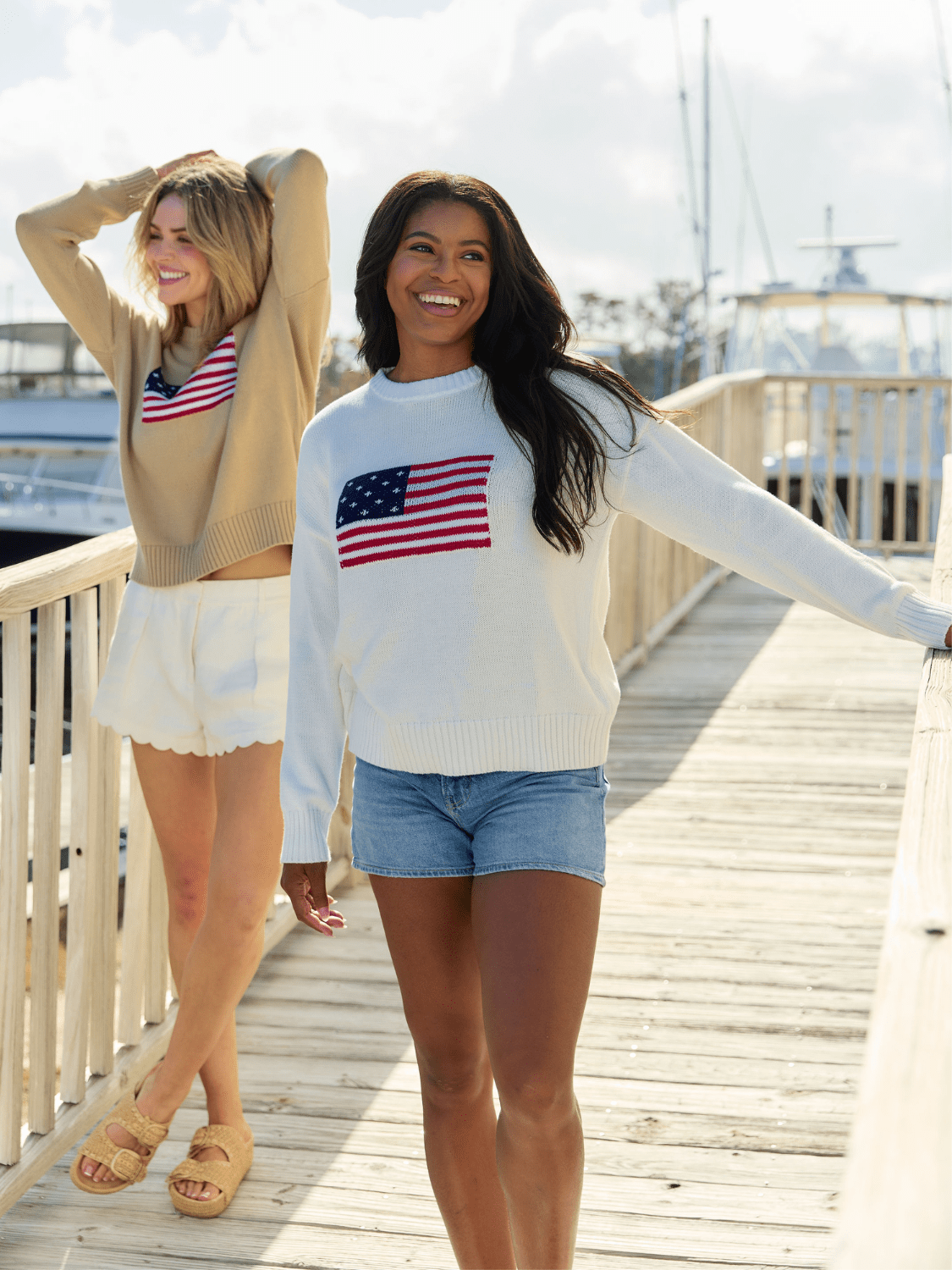 Our American Flag Sweater is an all-American classic with a timeless blend of elegance and patriotism. Made of 100% cotton this sweater is soft and versatile making it the perfect sweater.