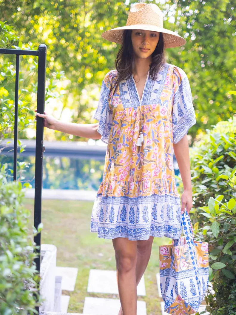 Silk cotton voile hand block flutter sleeve mini dress with tassel detailing