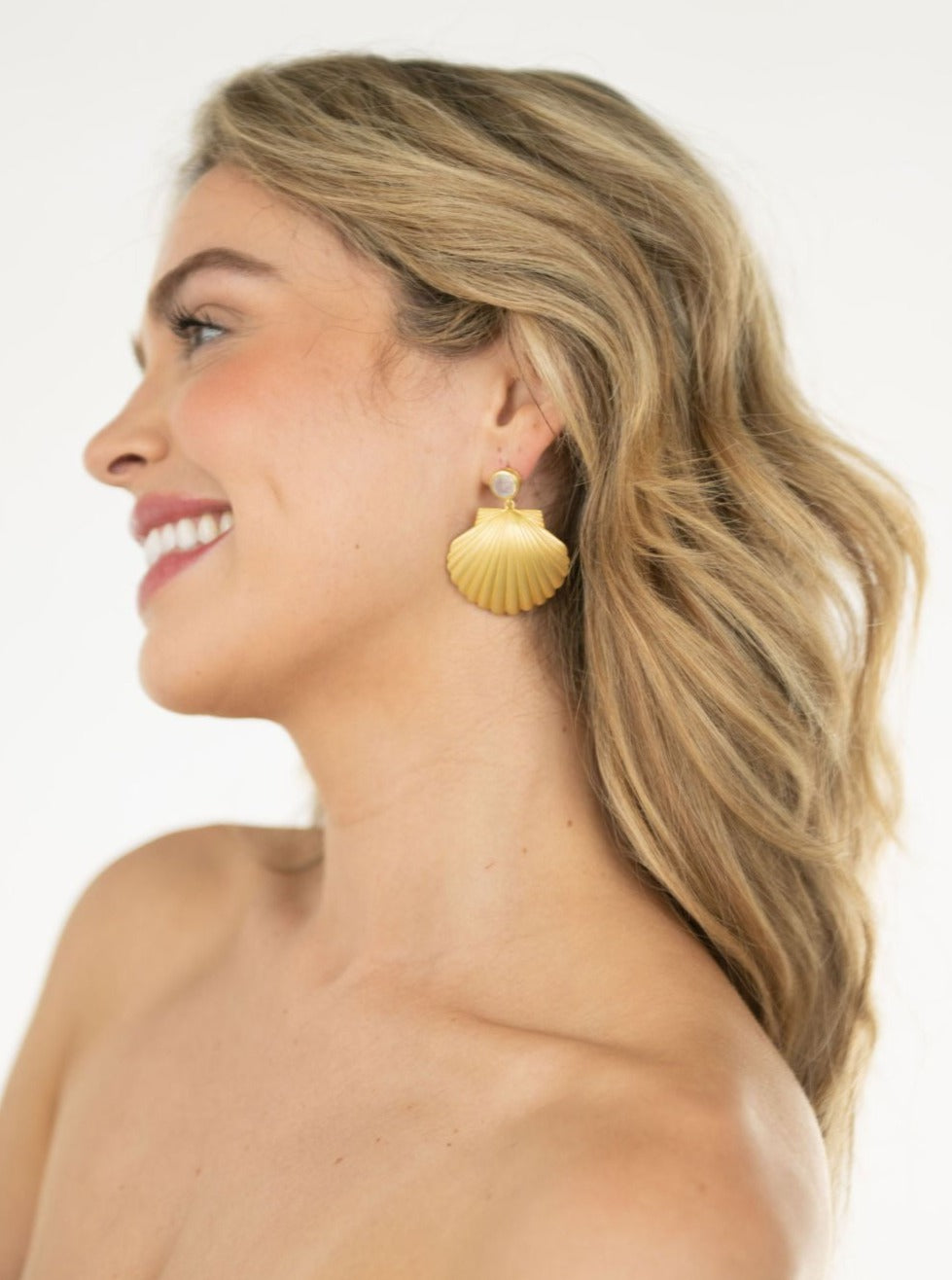 Inspired by the coast the Scallop Earrings will be a go to whether you're taking a walk on the beach, attending special soirées, or simply elevating your everyday style! Combining a glistening moonstone post and a dangling 18K plated-gold brass shell, these ethereal earrings will become timeless classics in your collection, cherished for years to come.
