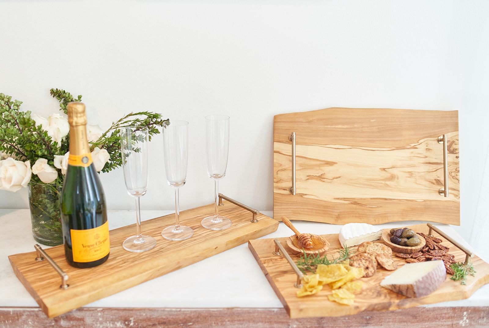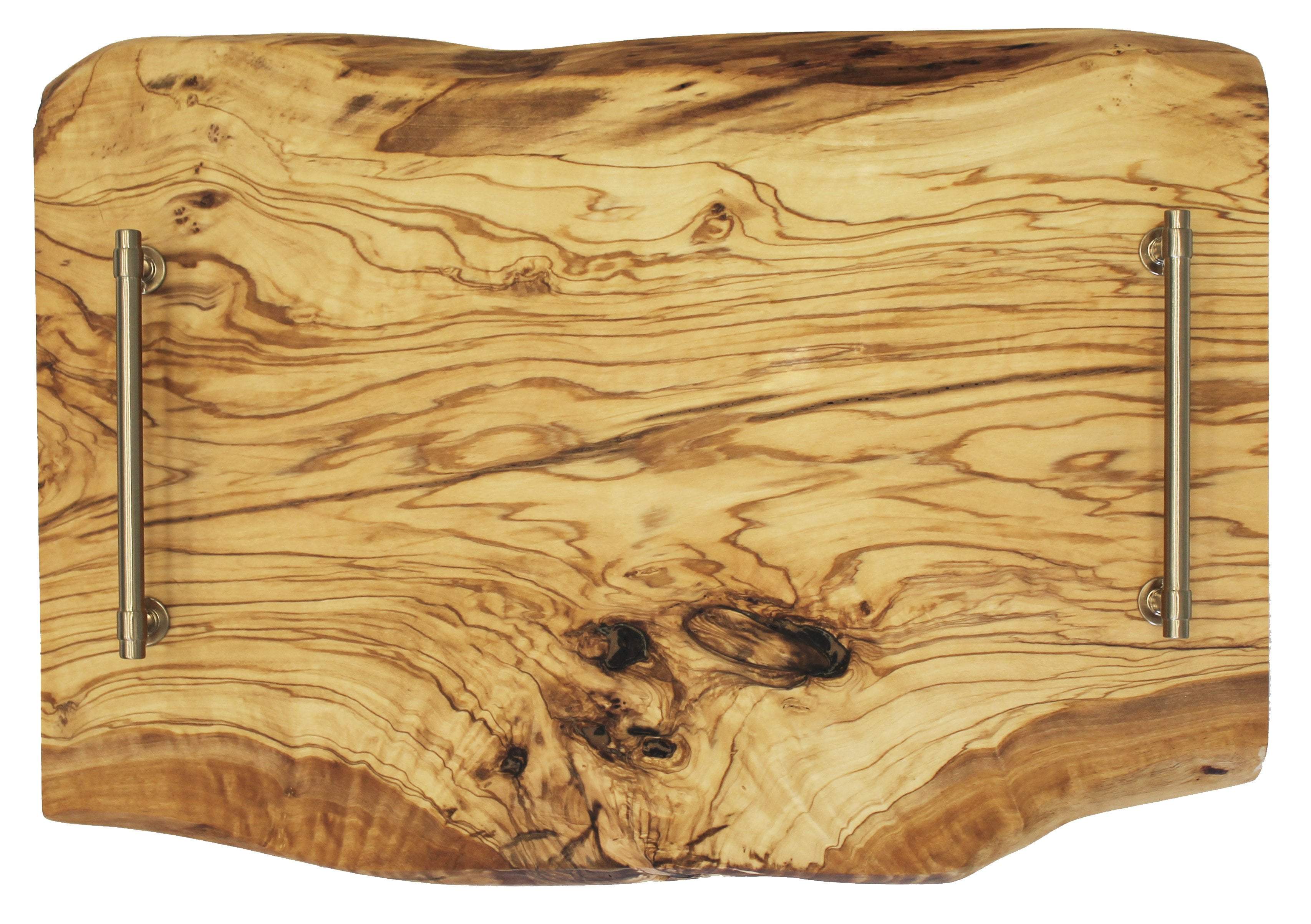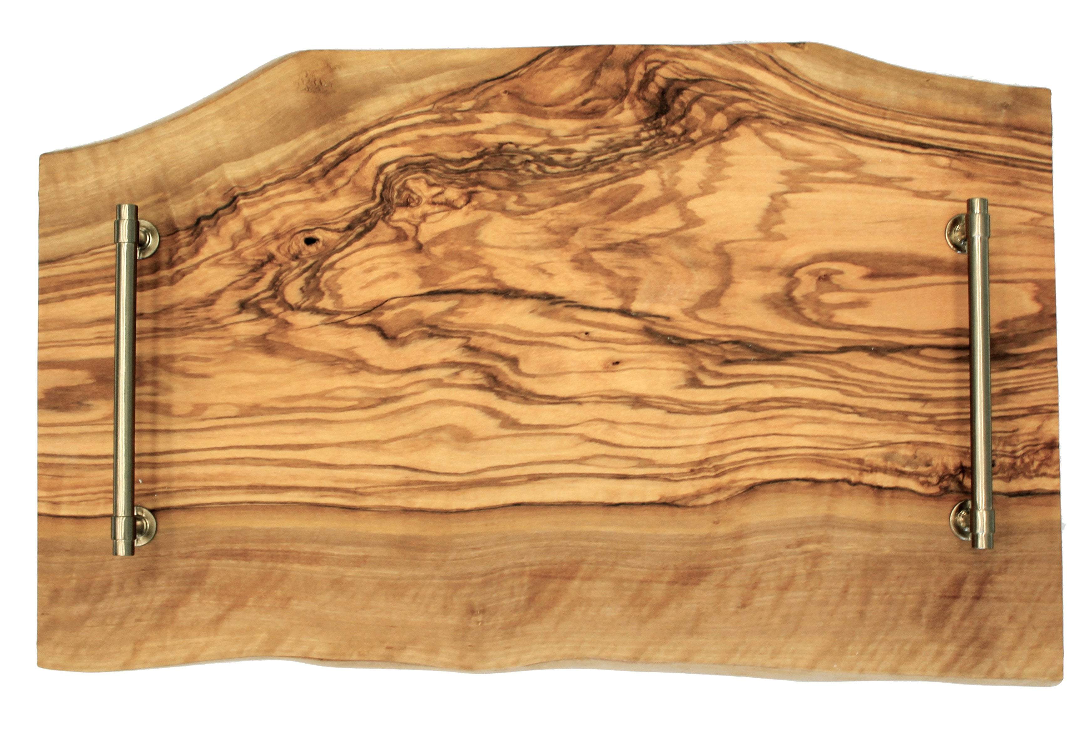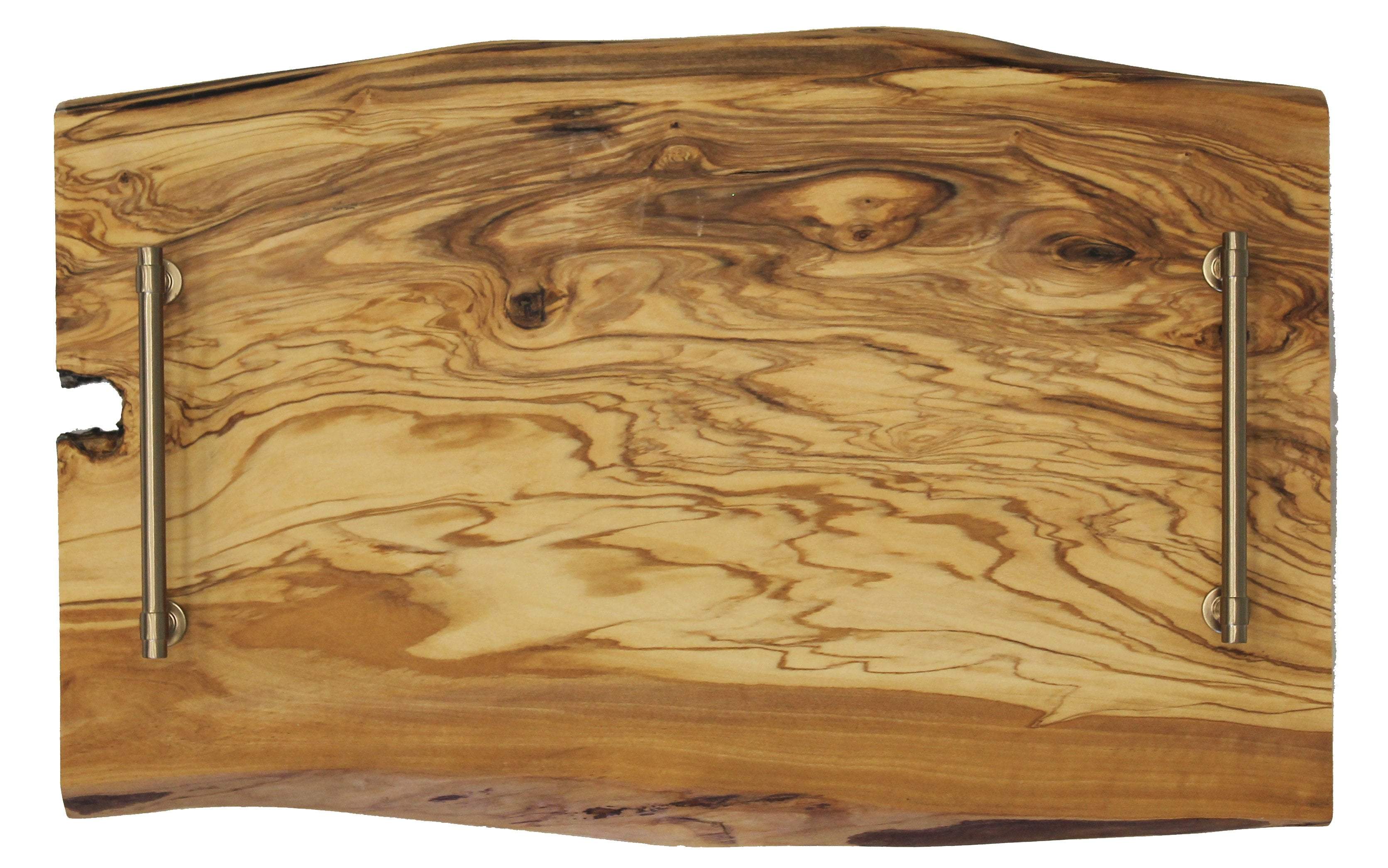 Shapes and grain patterns will vary from tray to tray, as will naturally occurring imperfections in the wood. All trays are prepared with three coats of food-safe spar varnish on the bottom, and four hand rubbed coats of food-safe Danish oil on the top to preserve the wood and to bring out its beautifully chaotic grain. The trays are finished with brushed bronze hardware.