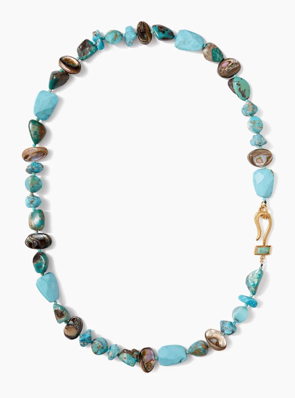 A celebration of natural gemstones, the Odyssey Hook necklace is a uniquely statement design. The necklace features a mix of turquoise and abalone with a distinctive hook detail. Style it alone or with shorter necklaces to complete the look.