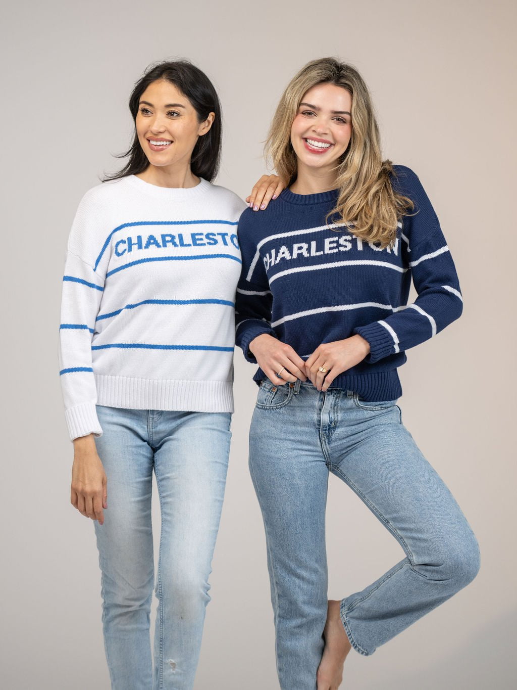 Introducing our Charleston Sweater in Navy Stripe, a nod to coastal charm. Featuring CHARLESTON lettering across the chest and crisp white stripes. This sweater blends timeless style with low country pride. Perfect for any occasion, it's a versatile staple for your wardrobe for any season.