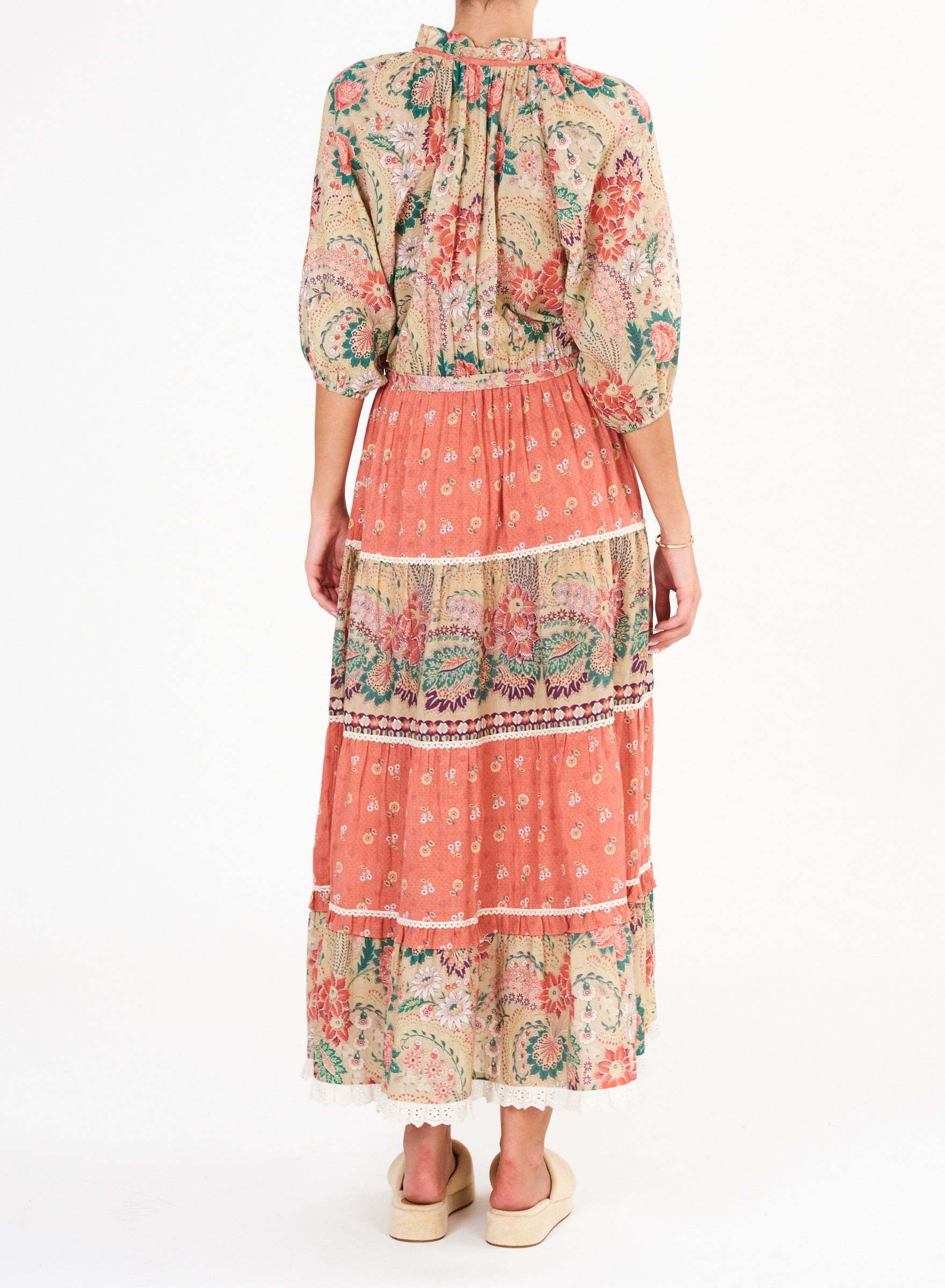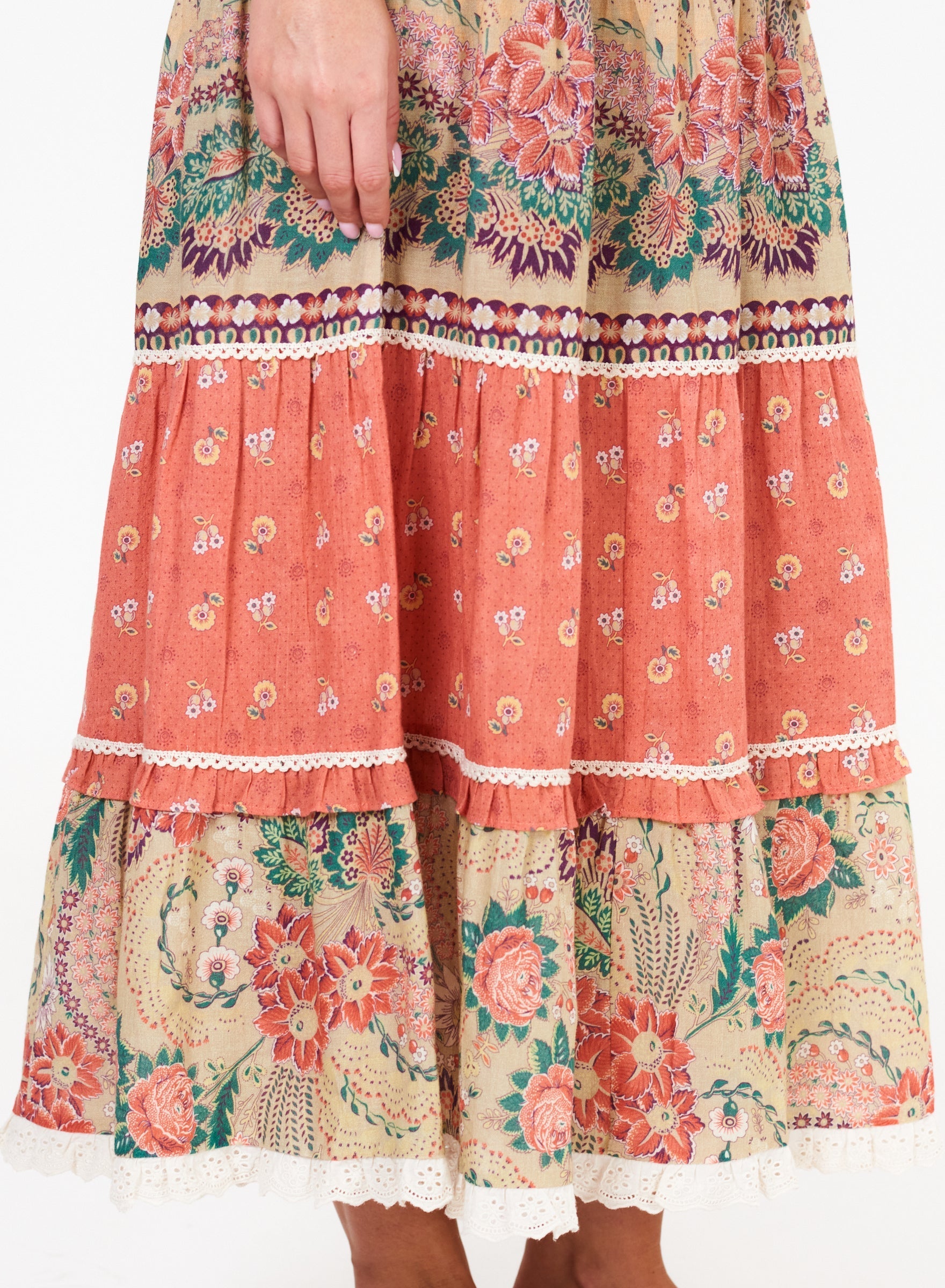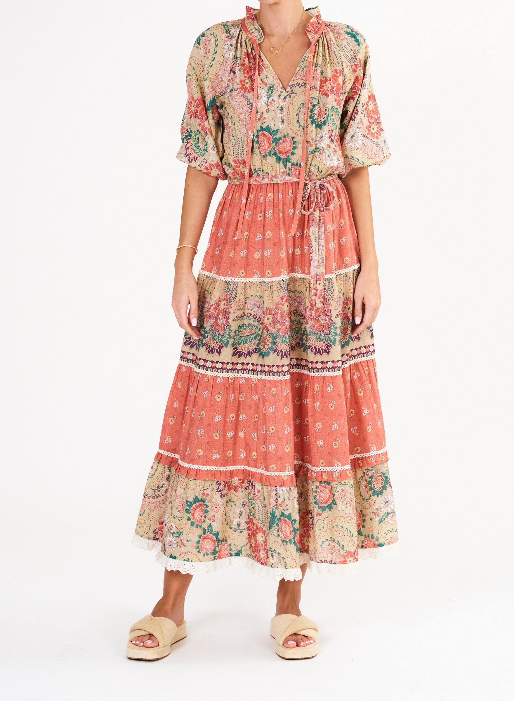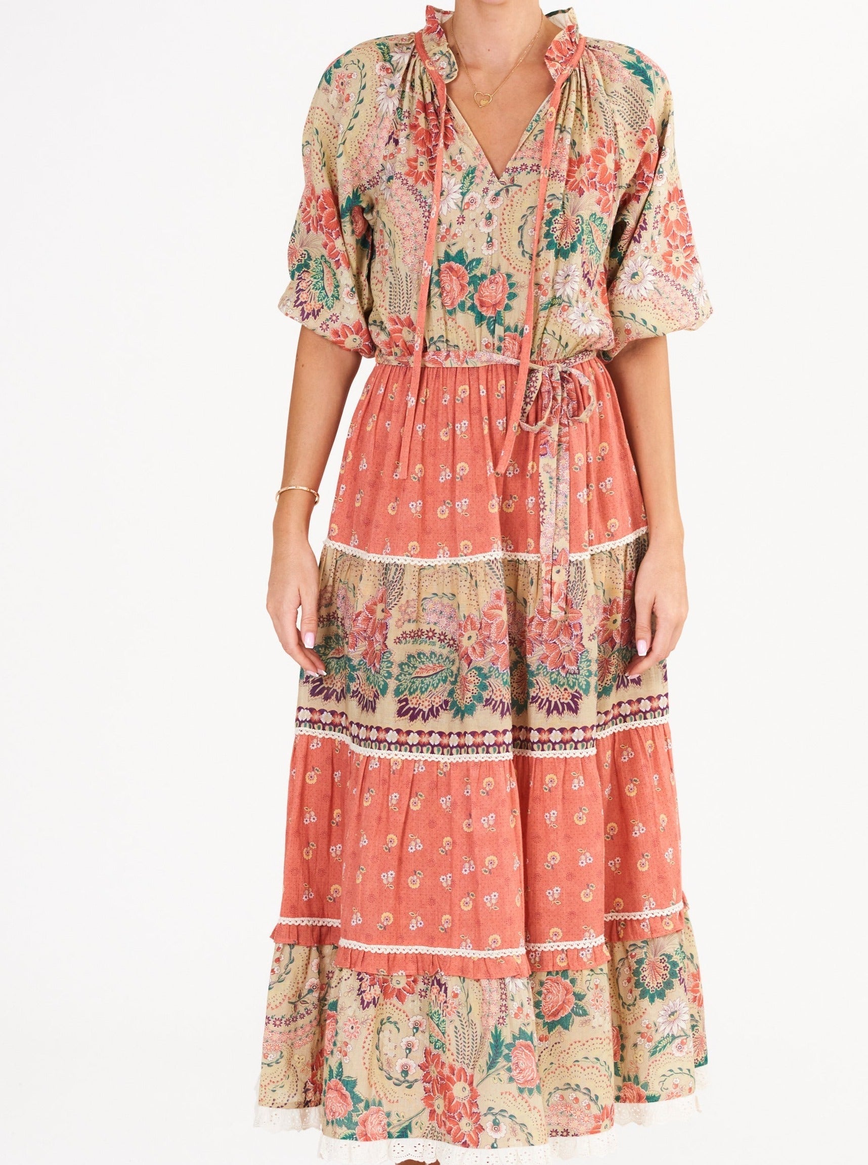 Crafted from lightweight cotton, the Dulcie Print Maxi Dress offers both comfort and style. With long sleeves and a coordinating print tiered bottom, this dress is perfect for any occasion. The v-neckline and tie waist add a touch of elegance to this versatile piece.