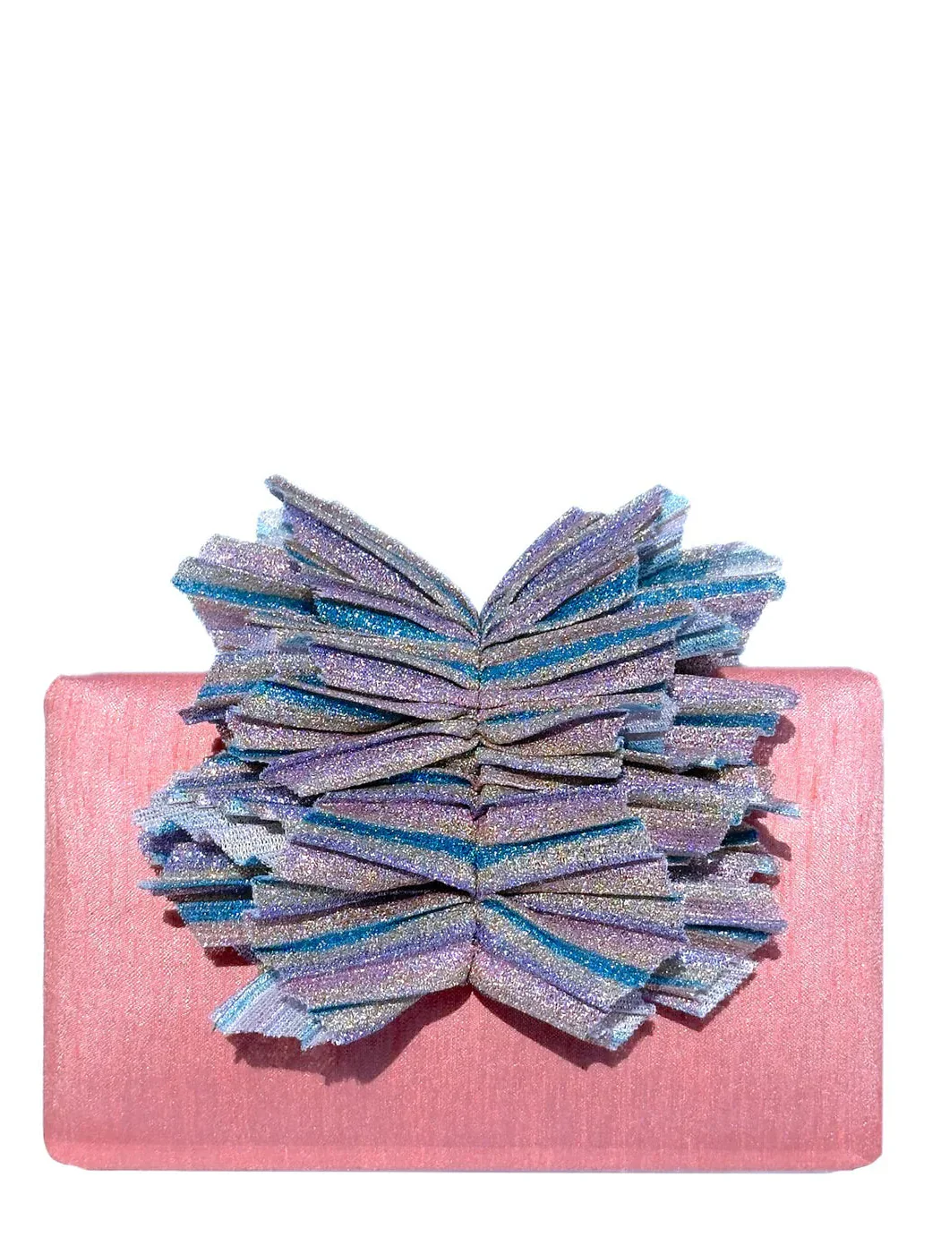 Featuring a blush-peach base with a sculptural, pleated bow that resembles iridescent wings mid-flight, this clutch is layered in shimmering pastel stripes of lavender, sky blue, champagne, and silver. Its oversized rosette detail adds magical volume and catches light from every angle, making it equal parts romantic and statement-making.