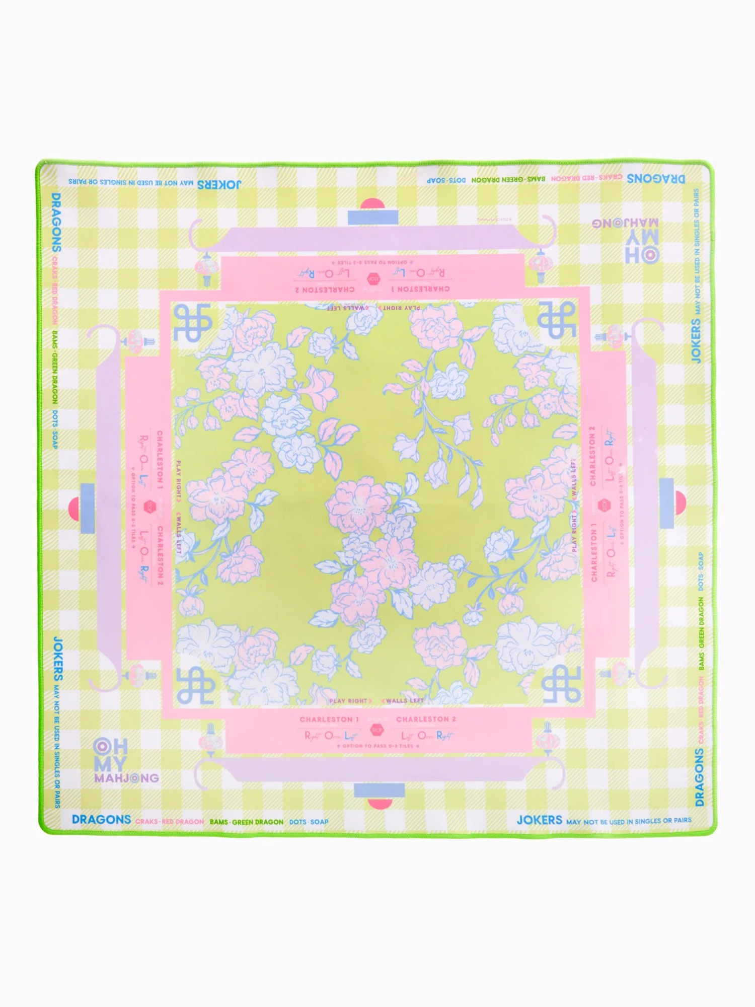 Introducing the Garden Party Mahjong Mat—a delightful combination of vibrant pastel hues and enchanting florals, intertwined with a charming green gingham pattern. This neoprene mat features a non-slip bottom to ensure your tiles stay perfectly in place, game after game. Adorned with delicate blossoms and inviting colors, it exudes a frilly femininity that is both elegant and playful. Along the sides of the mat, you’ll find the signature Oh My Mahjong instructional reminders, guiding you through each round.