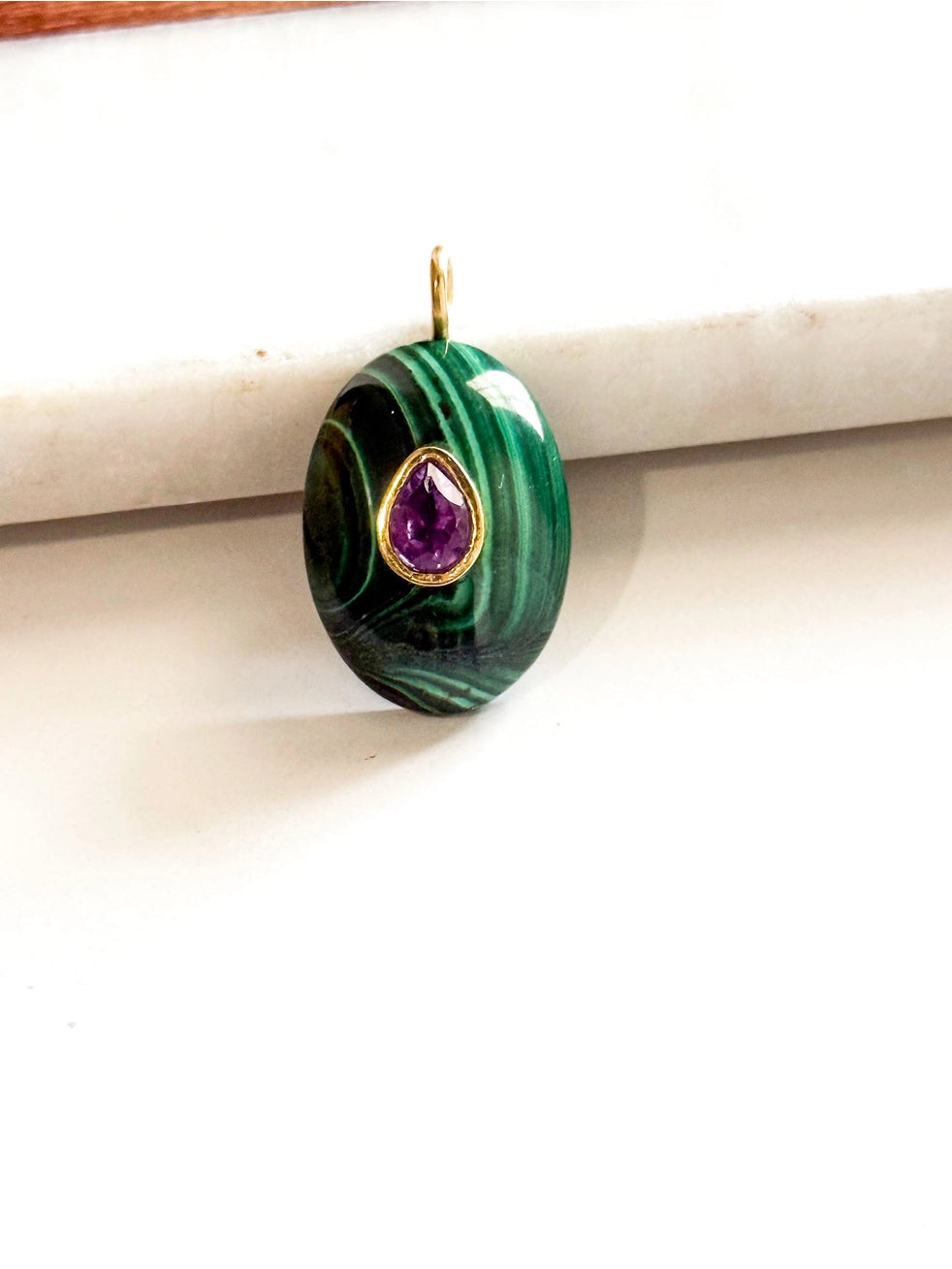 Handcarved Malachite/Bezel Amethyst Inlay Pendant Charm
