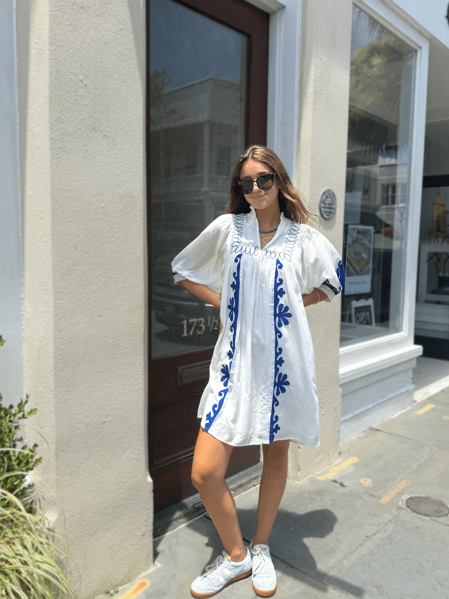 High Neck Dress in White & Navy Embroidery