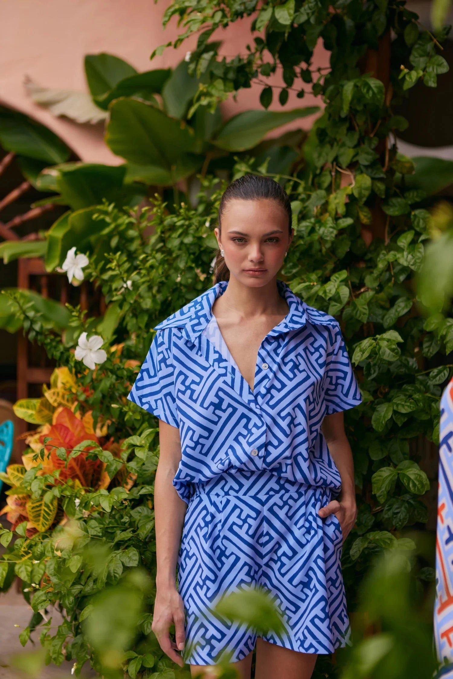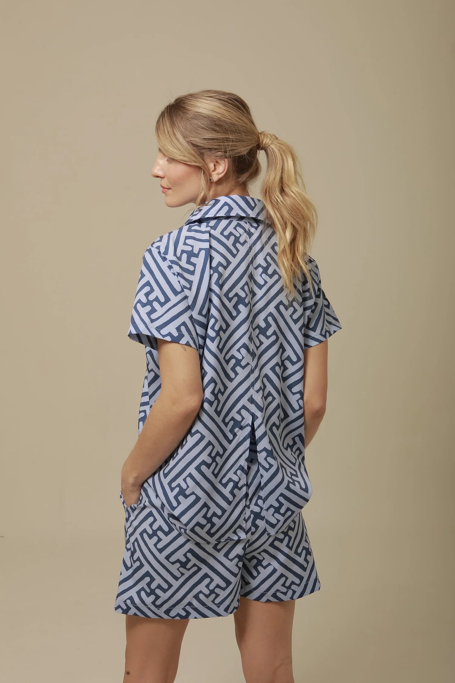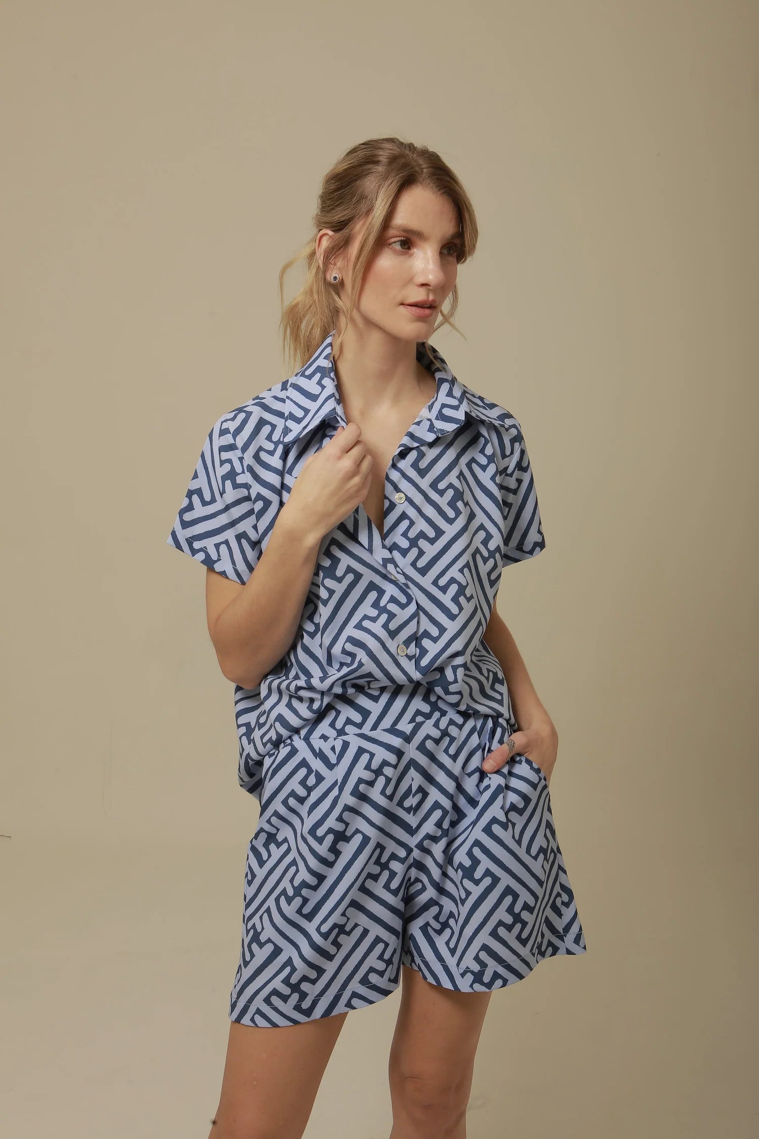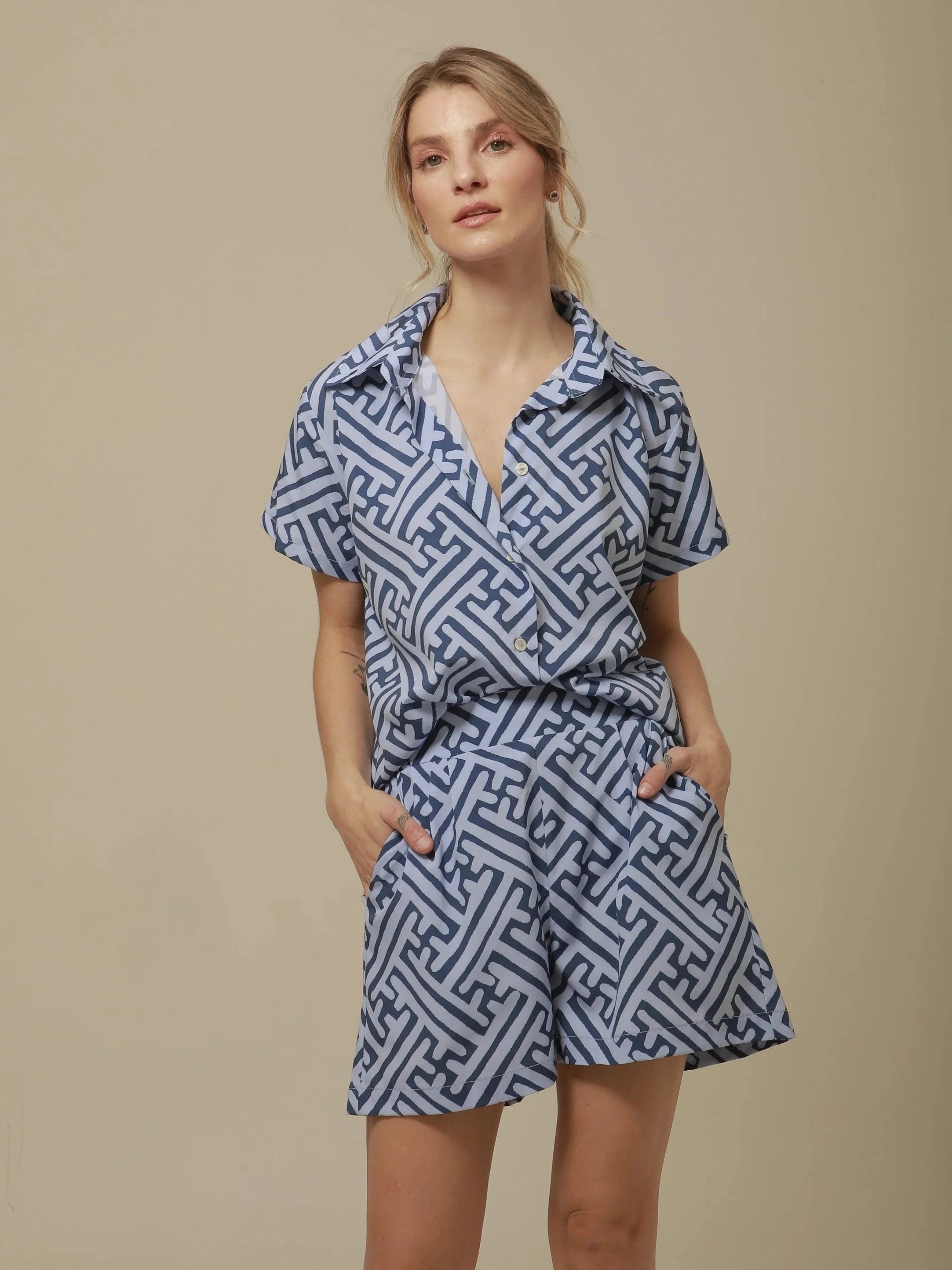 Tailored for effortless ease, the Mucura Shorts are your warm-weather wardrobe staple. Crafted from breathable, lightweight fabric, these high-waisted shorts feature a structured yet relaxed silhouette with side pockets. The bold geometric print in soft blue tones adds a modern, playful edge—perfect for pairing with the matching top or styling with a simple tank for everyday cool.