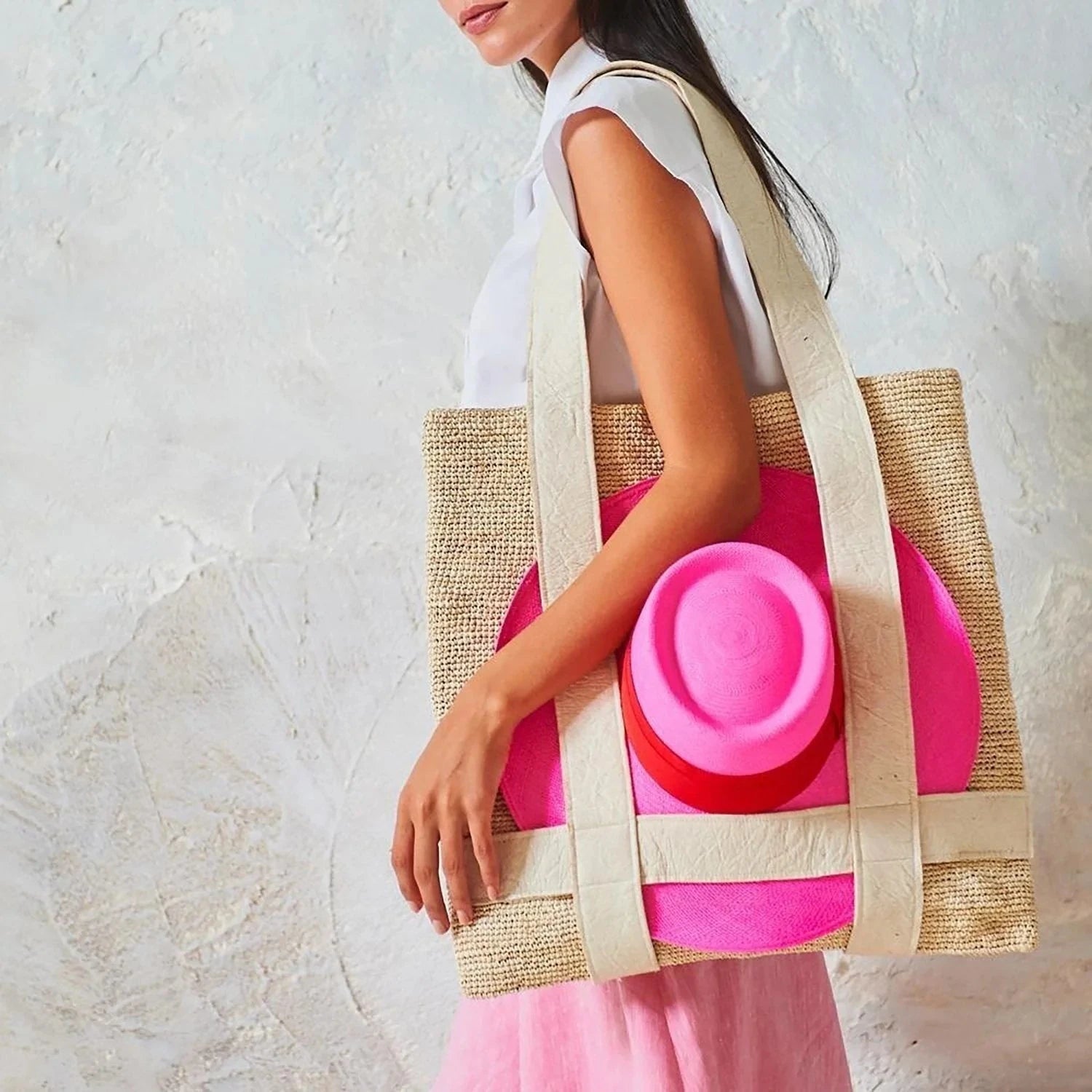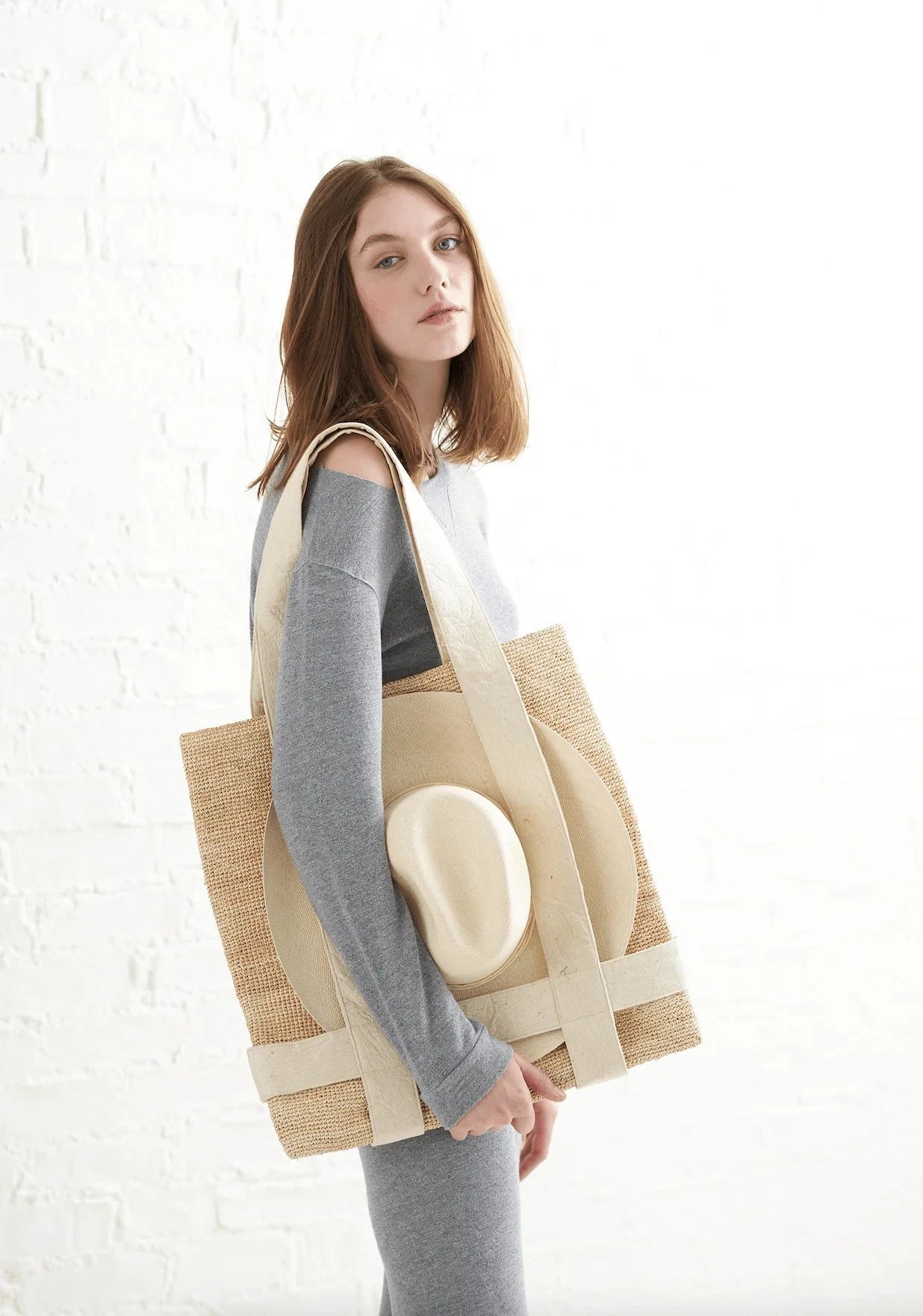 For jet setters and travelers, the Nativa bag is handcrafted with a toquilla straw soft weave and Pinatex (pineapple fiber) handles. Easily tuck your hat into the straps and be on your way.