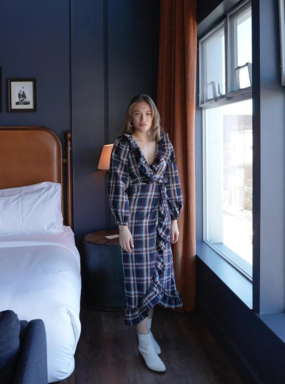 Long Wrap Dress in Navy Plaid