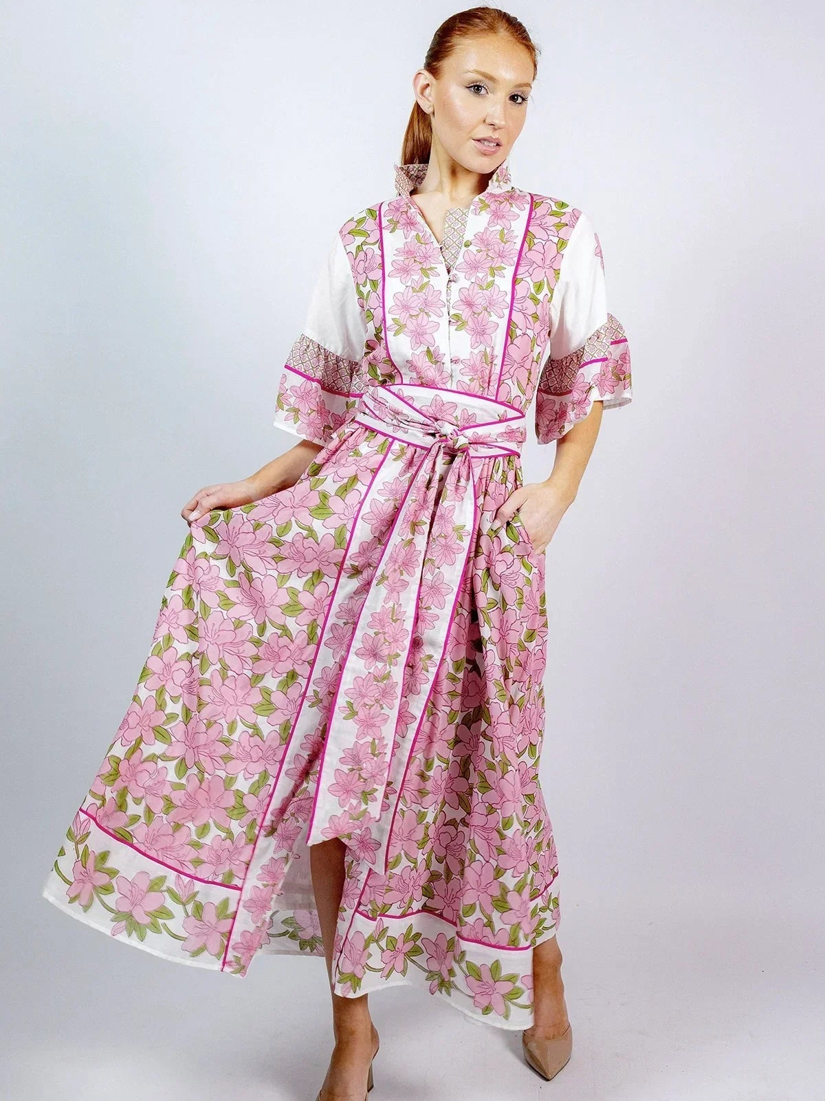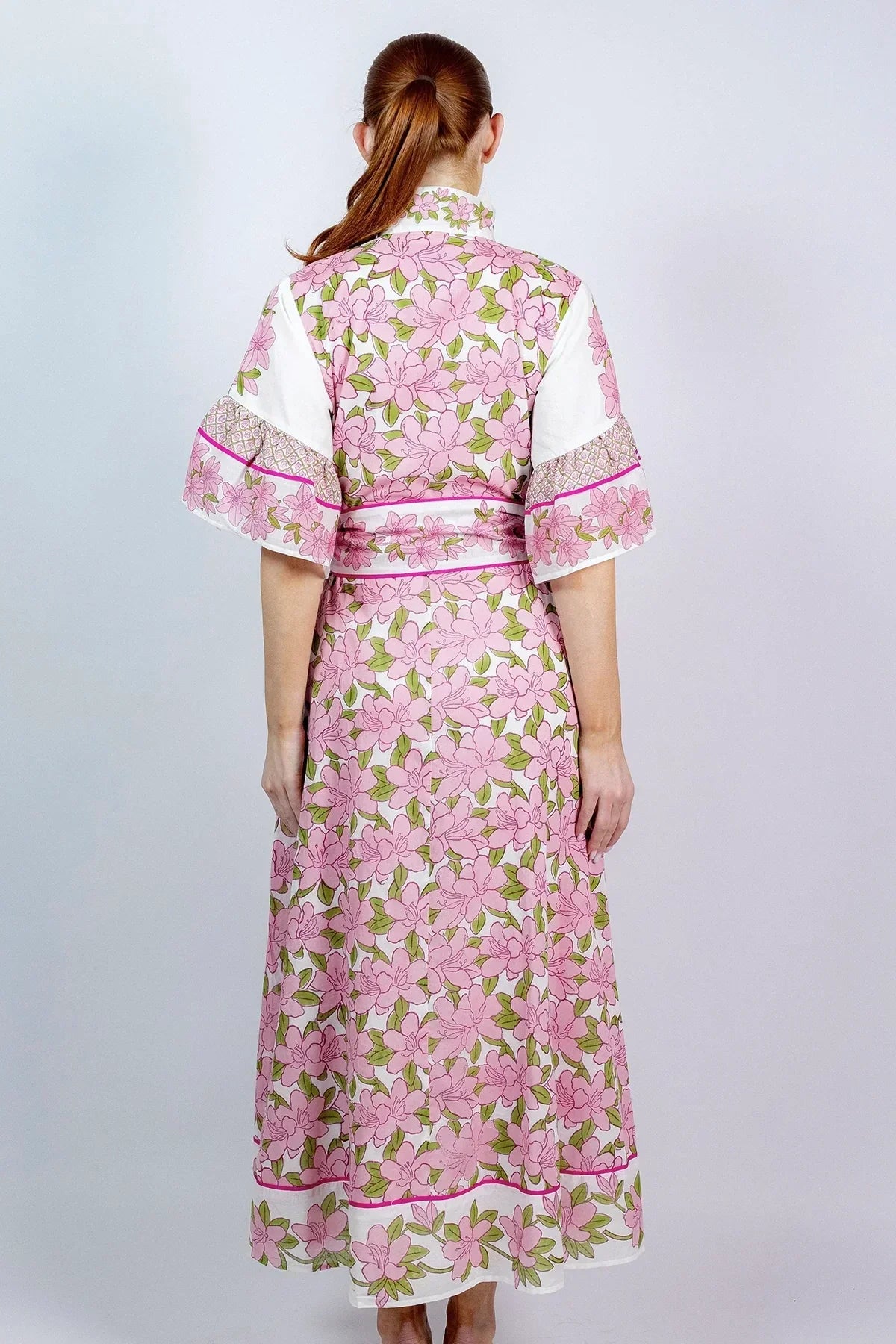 The Palladio Kaftan in Pink Azalea features a meticulously hand-drawn botanical print bursting with petal-soft blooms, a custom border, and delicate trellis detailing. This whimsical blockprint design transitions seamlessly from Easter brunches to spring gatherings, bridal showers, and warm-weather occasions. The relaxed kaftan silhouette offers generous ease through the chest—approximately 2 inches wider than the Flounce dress—making it ideal for comfortable, effortless layering. Perfect for those seeking a statement piece that balances playful charm with refined coastal style.