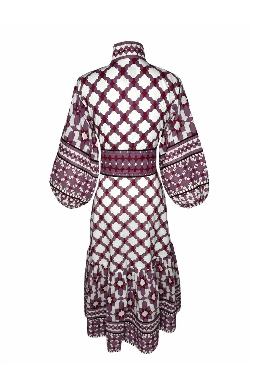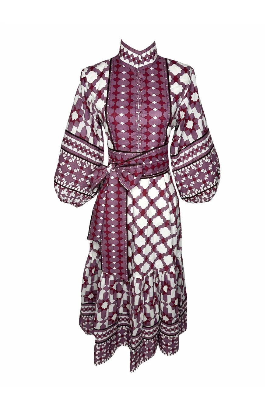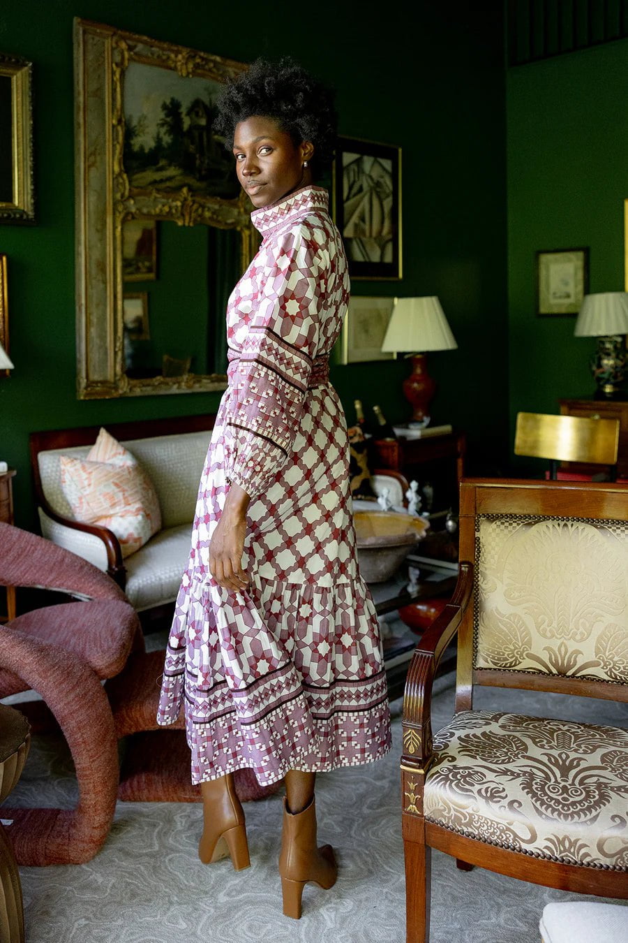 Paloma Flounce Dress in Plum & Burgundy Mosaic