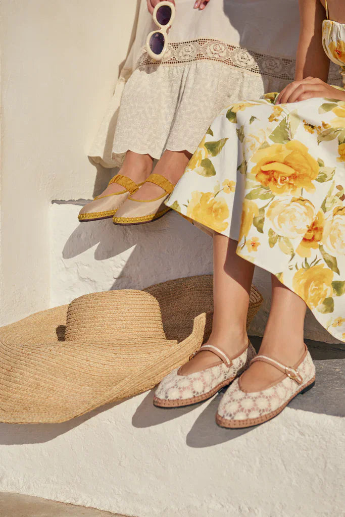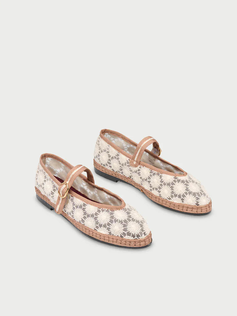 Elevate your ballet aesthetic with the Pierre Sun Flower, a sophisticated ballerina flat featuring delicate flower-printed mesh with refined beige piping. The breathable mesh upper pairs seamlessly with a secure white mesh strap and buckle closure for reliable fit. Inside, luxurious organic cotton lining with anti-bacterial treatment ensures comfort and freshness throughout wear. The standout sole—crafted from recycled bicycle tire rubber—delivers durability while supporting sustainable practices. A thoughtfully designed shoe that merges style, performance, and environmental responsibility.