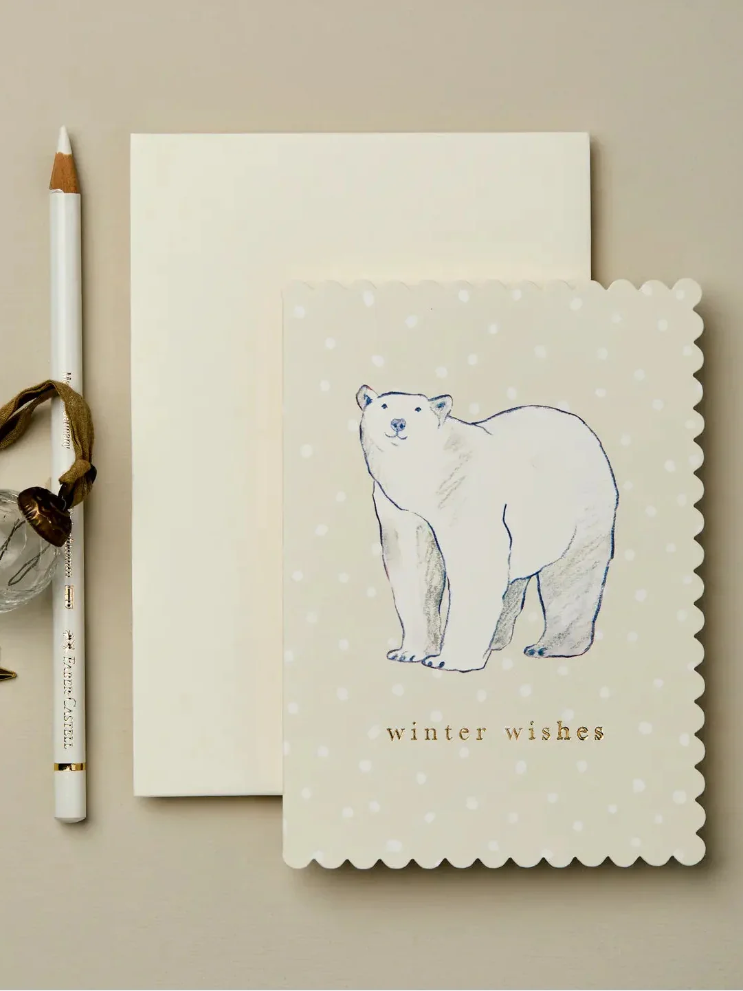 This adorable polar bear design features a die cut scalloped edge, monochrome color palette and golden foil on the front and back of the card. We've paired this card with a luxury cream envelope.