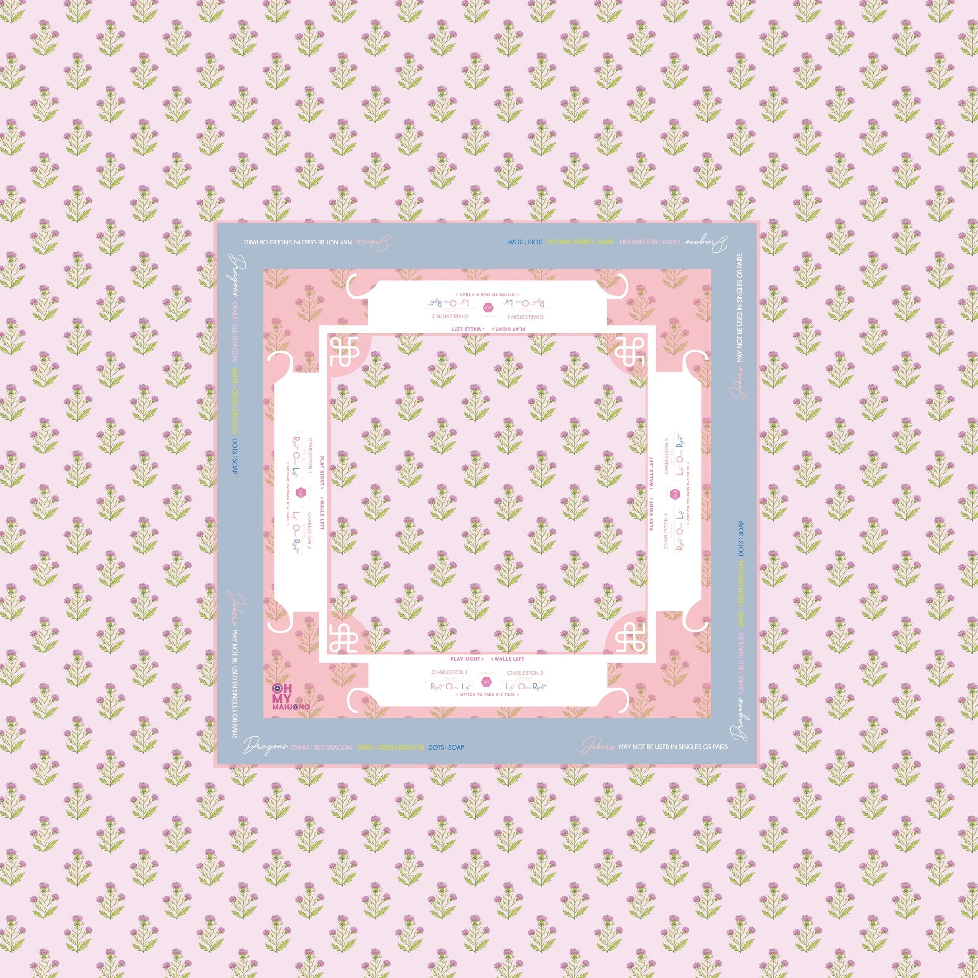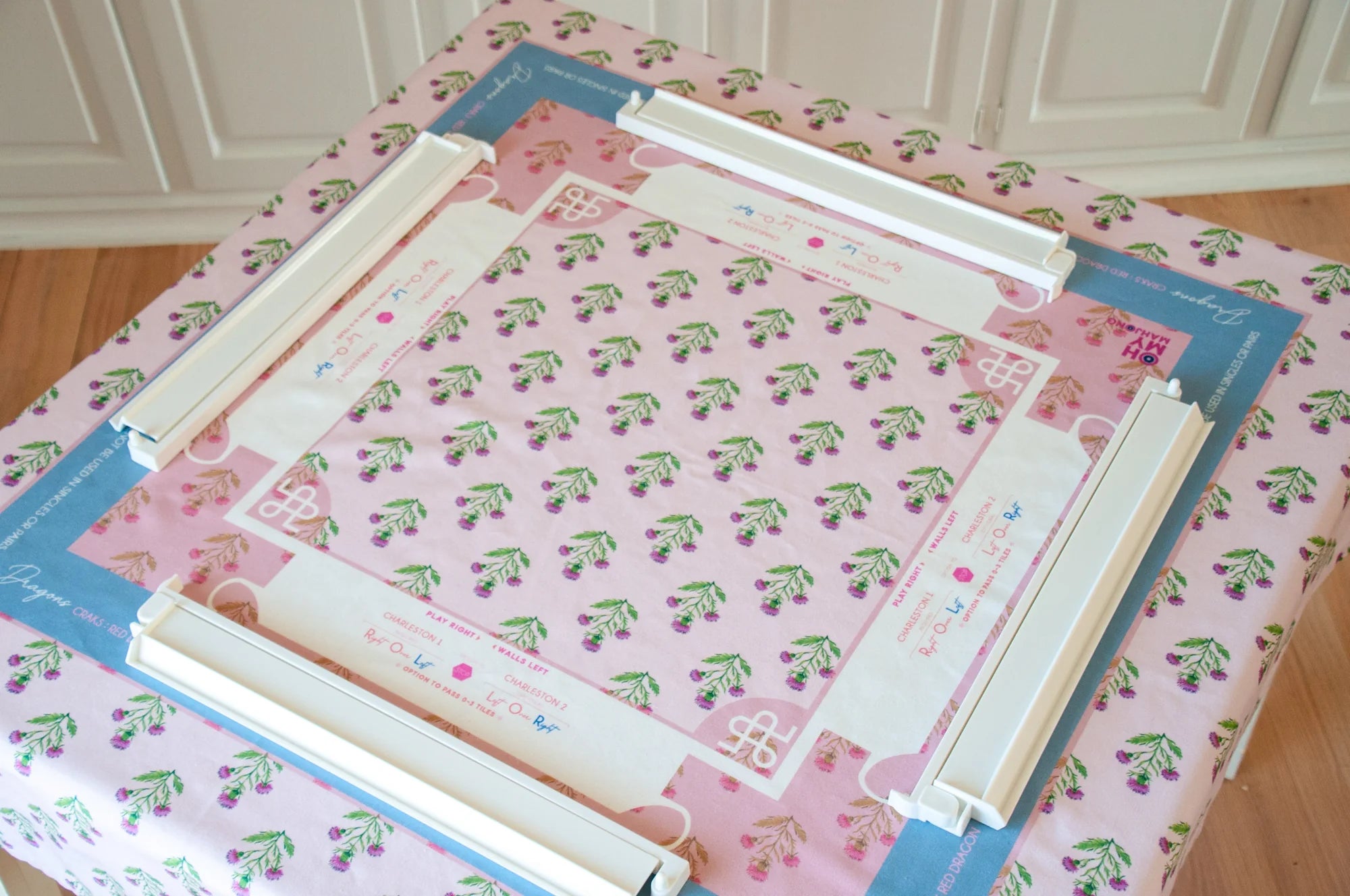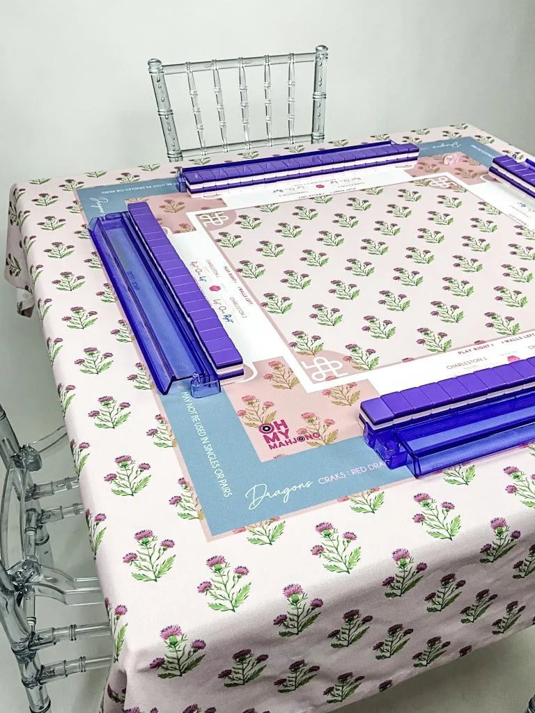 Cotton tablecloth includes essential rules for American Mahjong, covering everything from directions of The Charleston, suit and dragon pairings, gameplay and wall direction and the pesky no jokers in a pair rule.