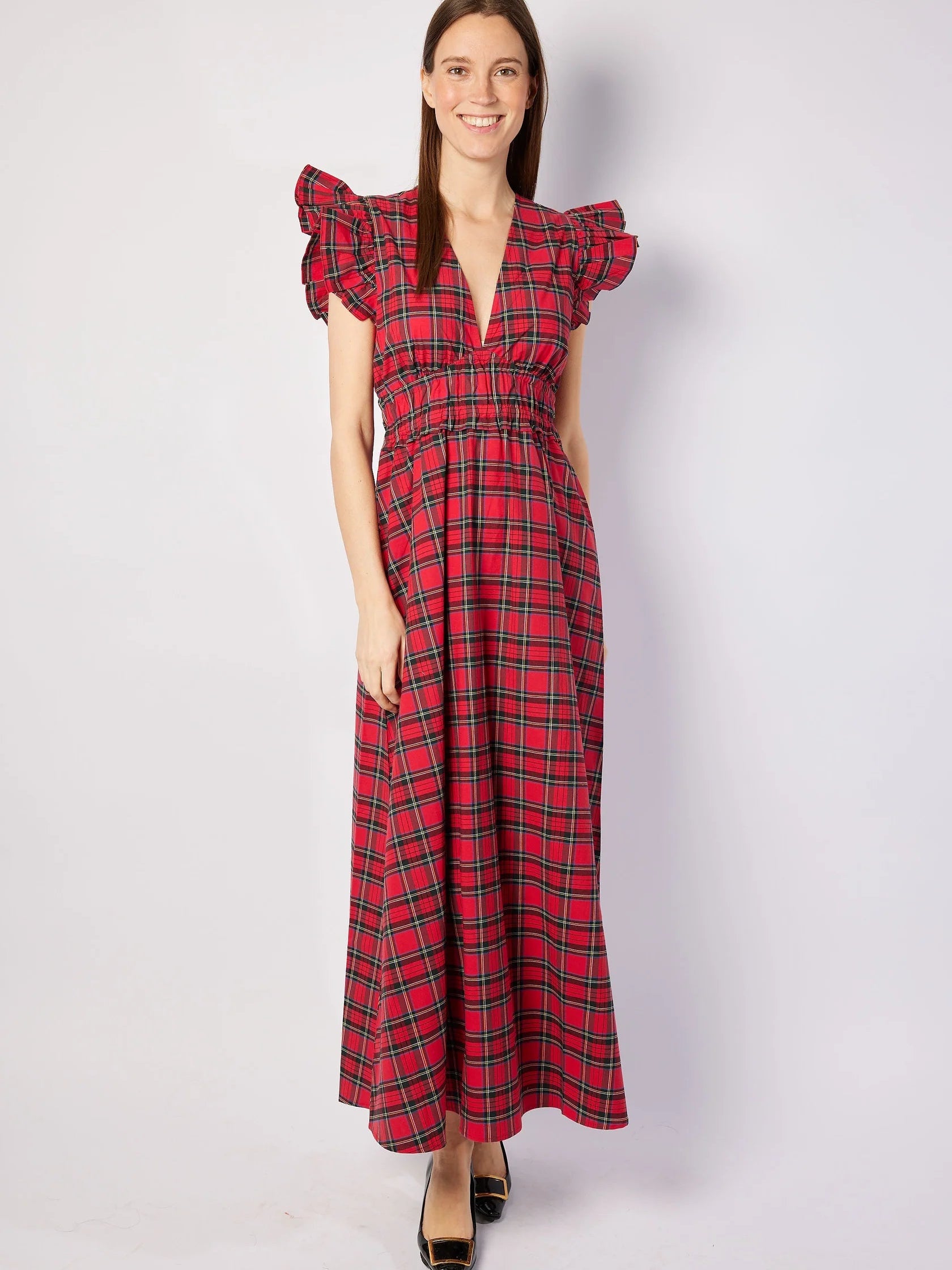 Red Tartan V-Neck Flutter Sleeve Maxi