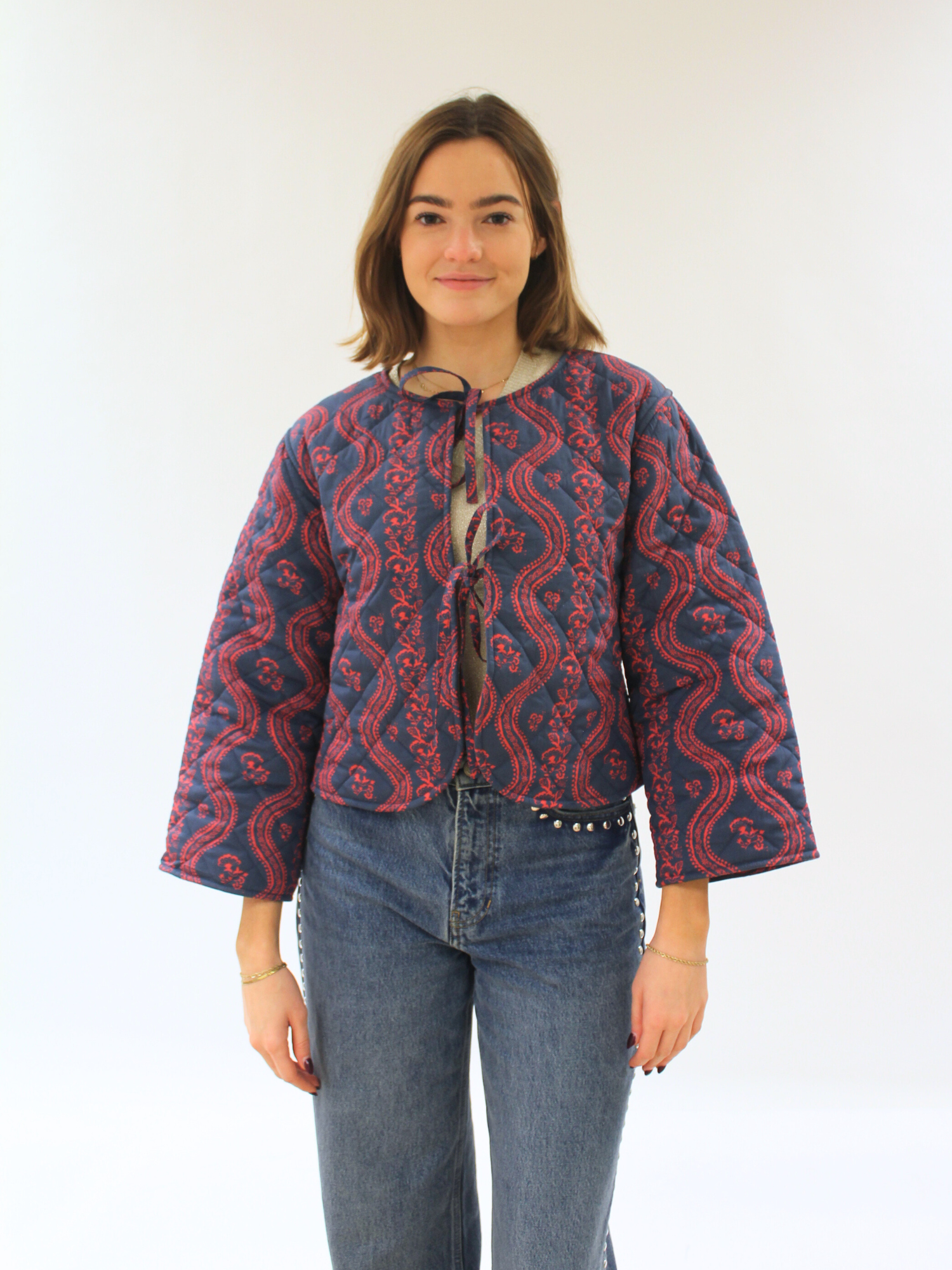 A cropped quilted jacket in our Navy Virginia Stripe print. Features two tie closures at the front and a relaxed, easy fit. The perfect lightweight layer for everyday wear.