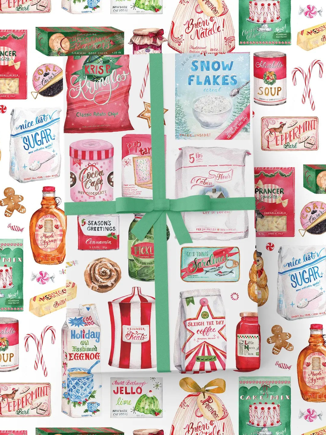 Bring holiday magic straight from Santa’s kitchen to your gift wrapping with the Santa’s Pantry Wrapping Paper. This festive, vintage-inspired design is packed with nostalgic holiday favorites—think retro cereal boxes, whimsical food packaging, candy canes, eggnog cartons, gingerbread, and other pantry staples illustrated in playful watercolor.