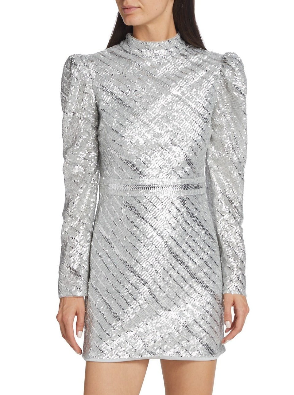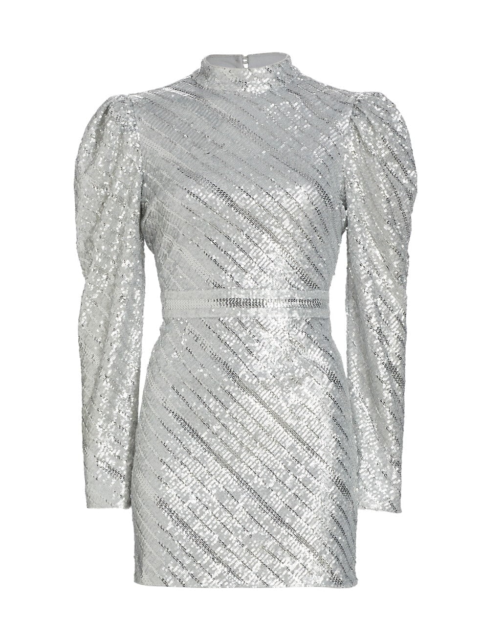 Saylor's Pollie sequin body-con minidress features a bias-cut silhouette with a mock turtleneck and mutton sleeves.