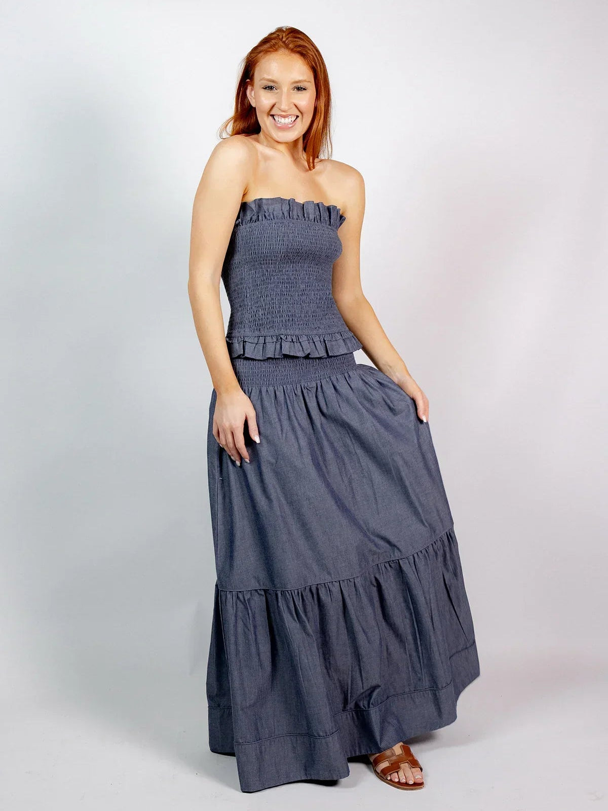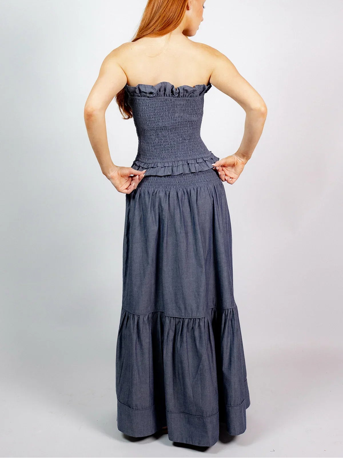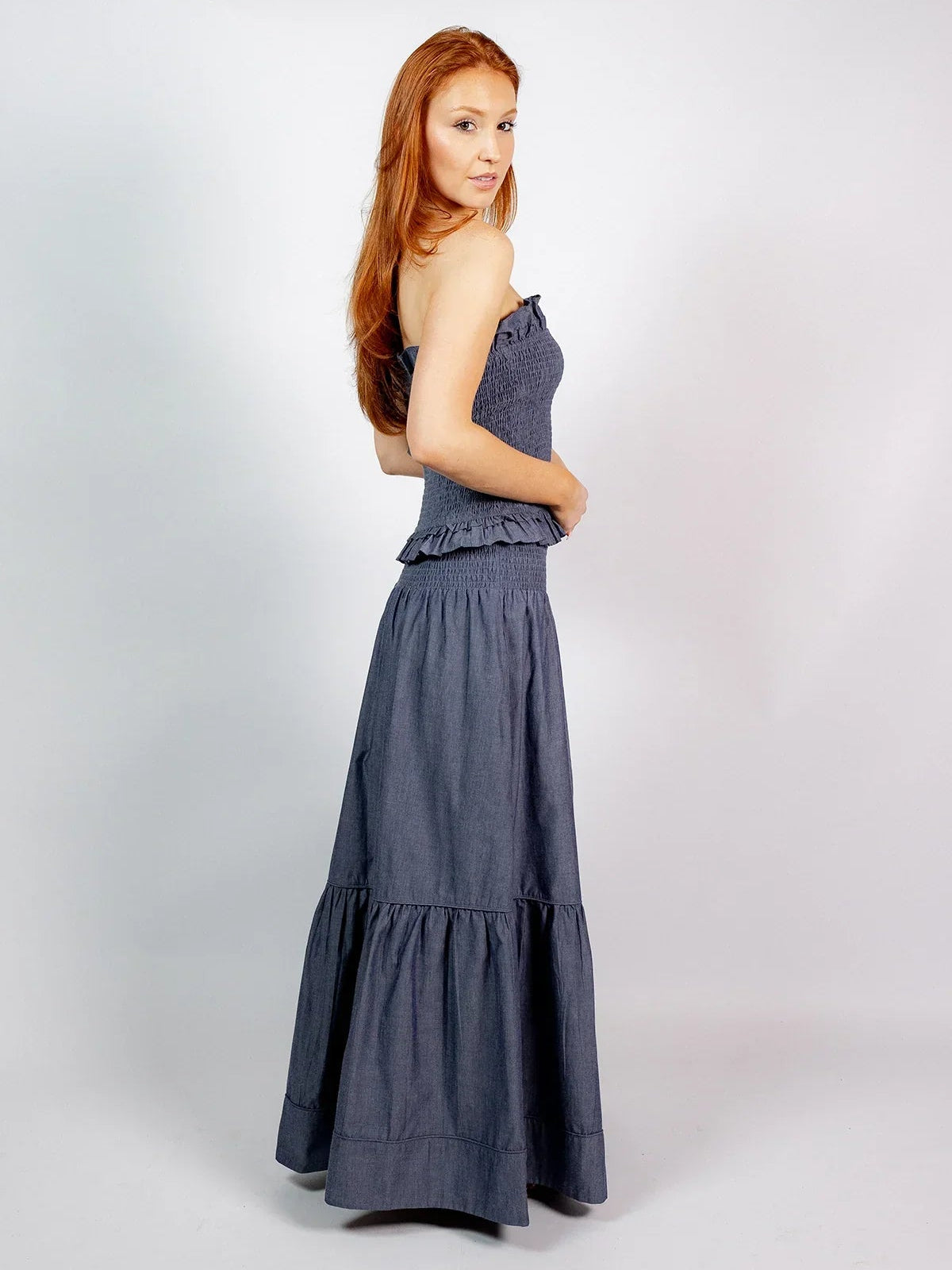 SUE SARTOR Flounce Smocked Waist Skirt | Indigo Chambray