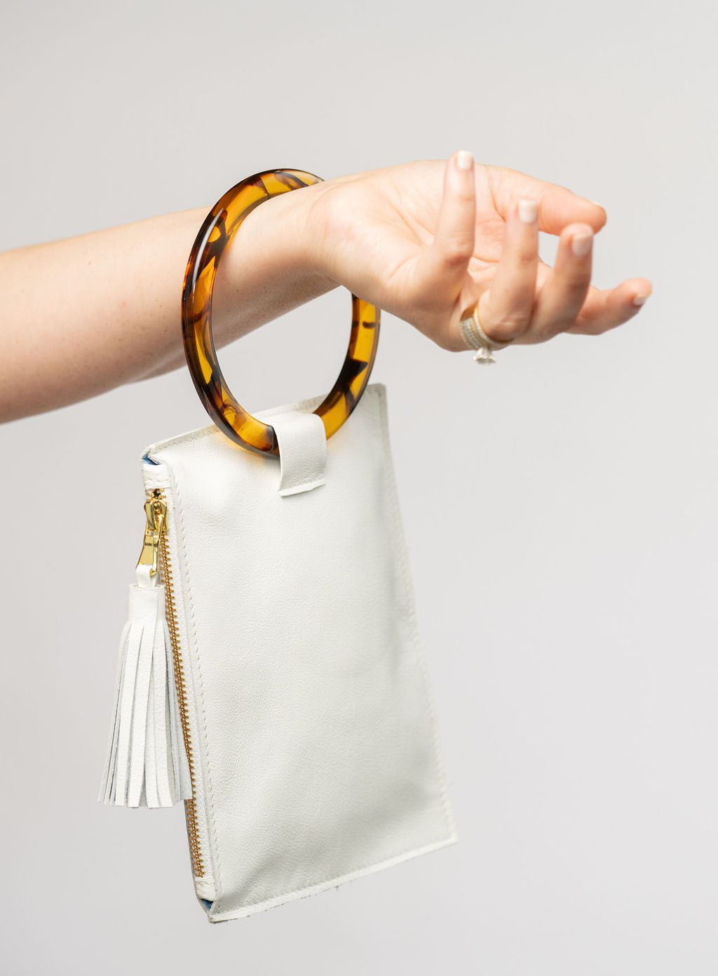 Measuring 8 inches x 5.5 inches and lined with broadcloth cotton, our Ring Wristlet is perfectly sized for storing your essentials. The 4-inch light tortoise acrylic ring will fit any wrist!