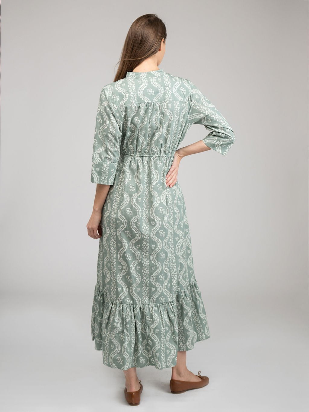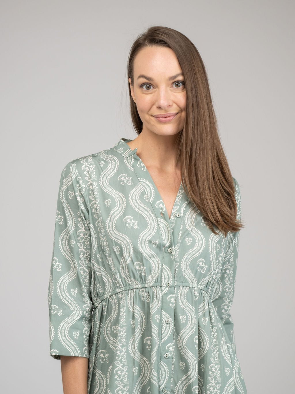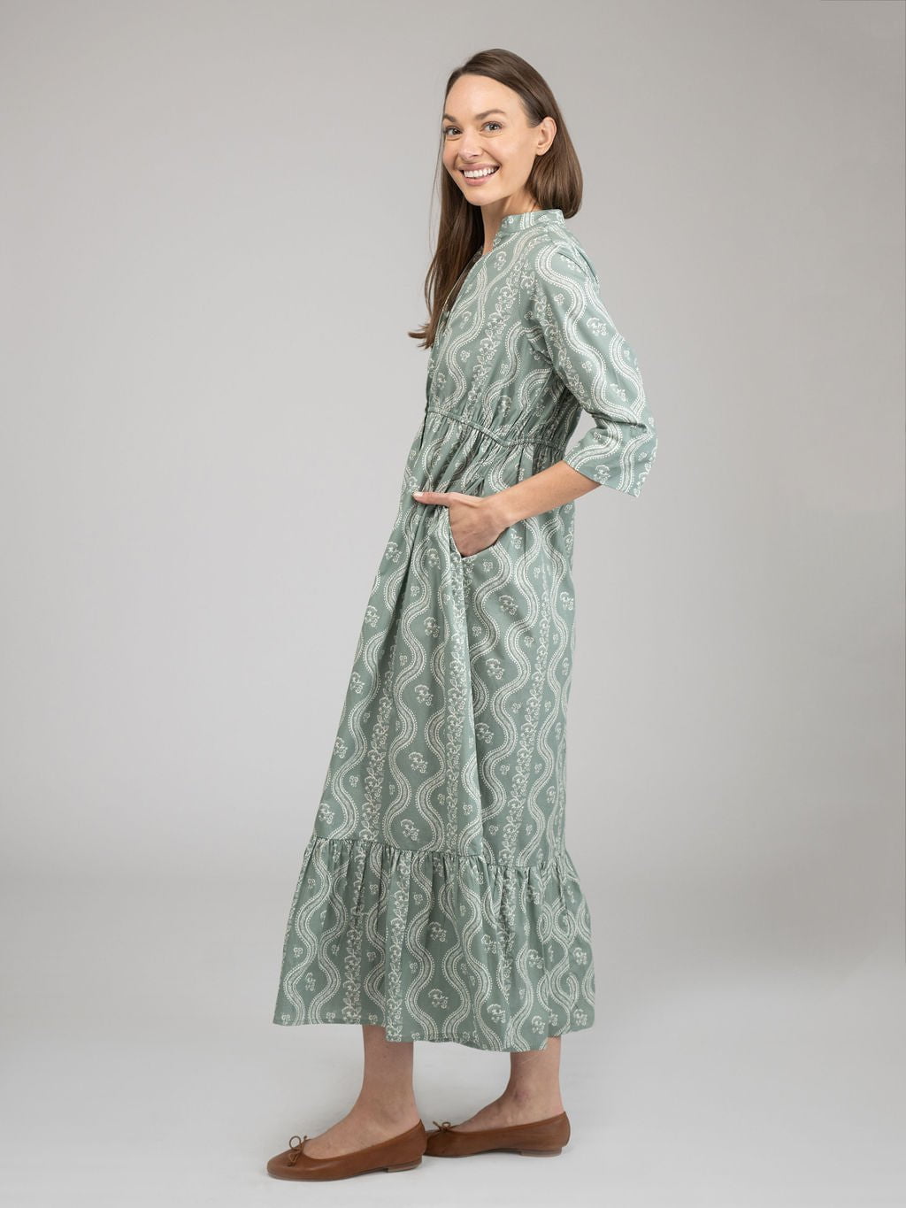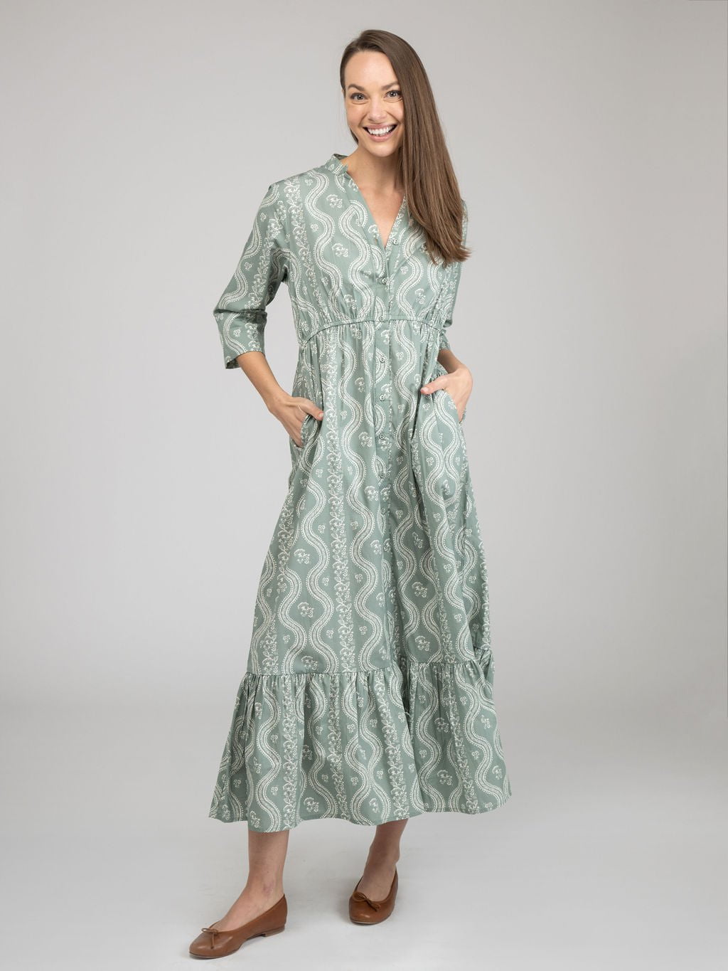 The Christie Dress in Sage Virginia Stripe features a flattering V-neckline and elegant three-quarter sleeves. It has a delicate flutter hem and pockets to always provide you with convenience and style.