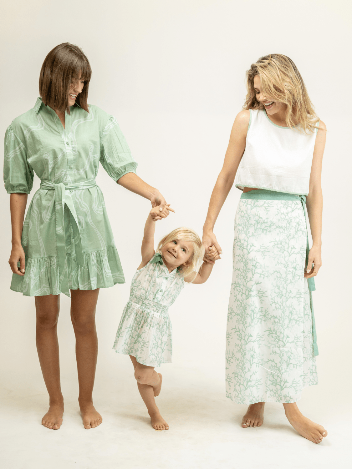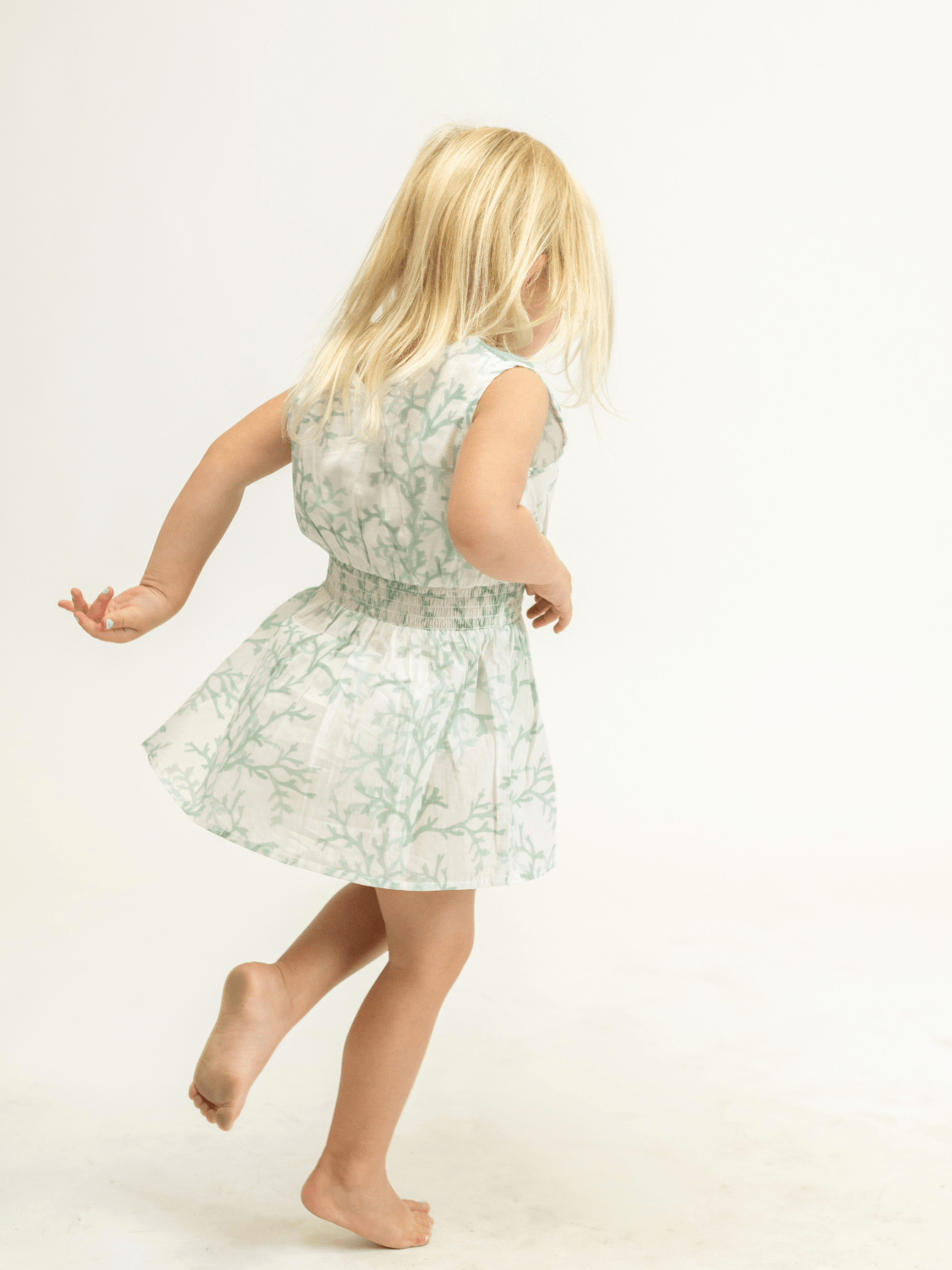 The Julia Dress in Green Coral features an elastic waist, playful ruffle shoulder details, and a delicate button front. The sleeveless design and elastic waist makes this a comfortable and adorable dress for all day play. Perfect for any occasion, your little one will love twirling in this charming dress.
