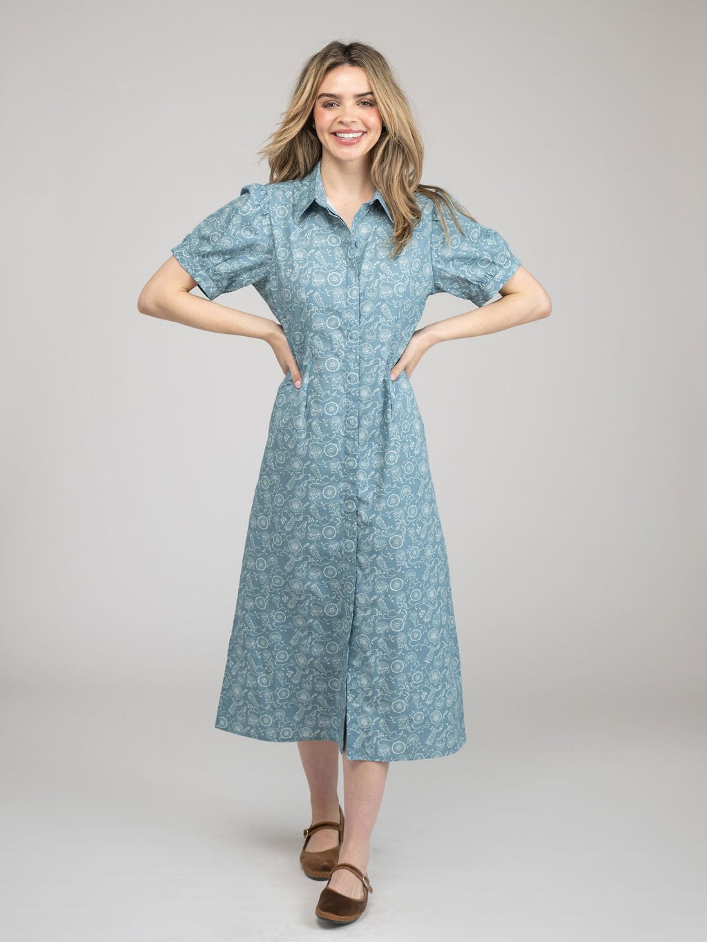 The Kris Dress features a collared neckline, short length puff sleeve with elastic cuff and a button front closure.