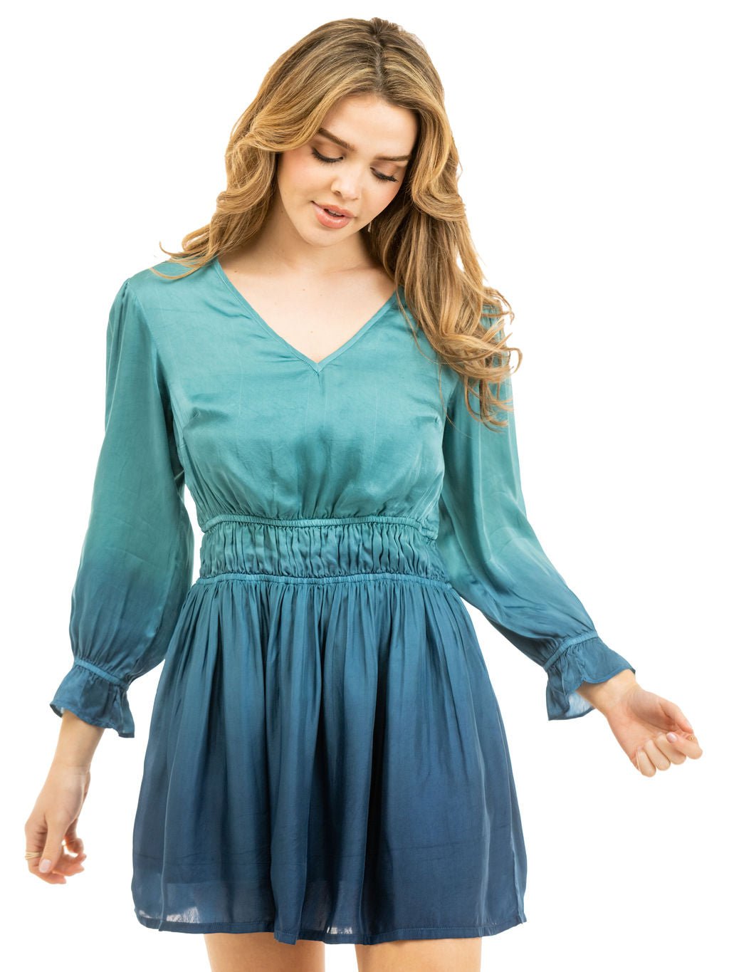 The Marie Mini dress is a classic cut with a flattering v-neckline, long sleeves and a double elastic cinched waist. Dress is up or down. Wear with your favorite pair of boots or heels. Made from 100% Cupro Satin and featured in our Blue Ombre dying technique.