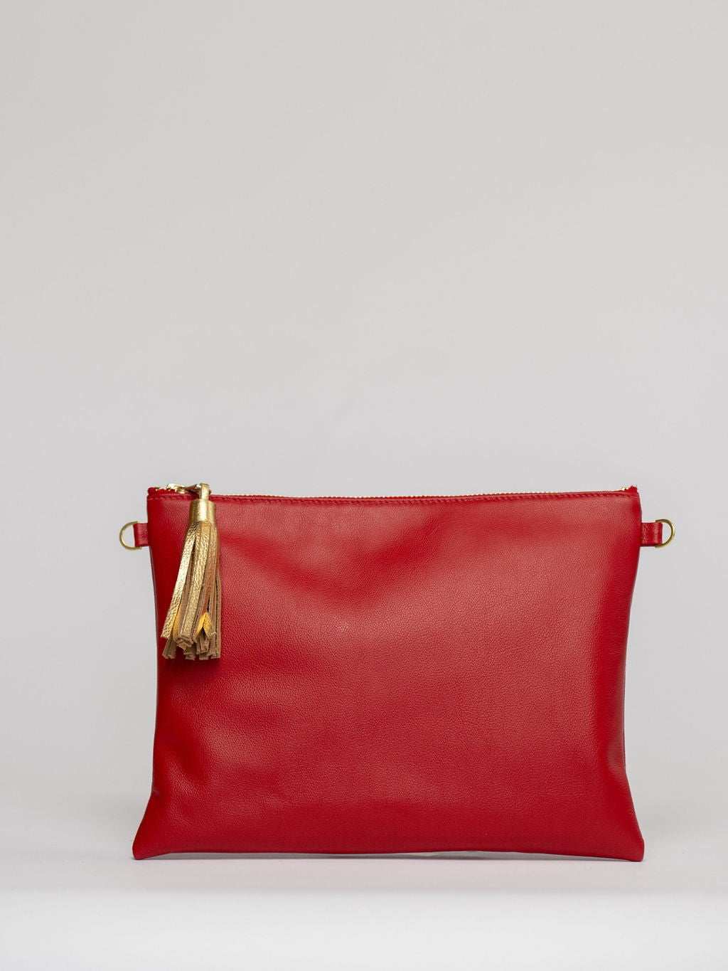 Our signature Sconset Clutch + Crossbody is proudly made in America and has been a bestseller since 2013. This bag is made from high-quality, super-soft red leather sourced from a premiere hide house in California. The leather is shipped to New York City, where our bags are produced by expert craftsmen and finished with a smooth zipper and leather tassel.