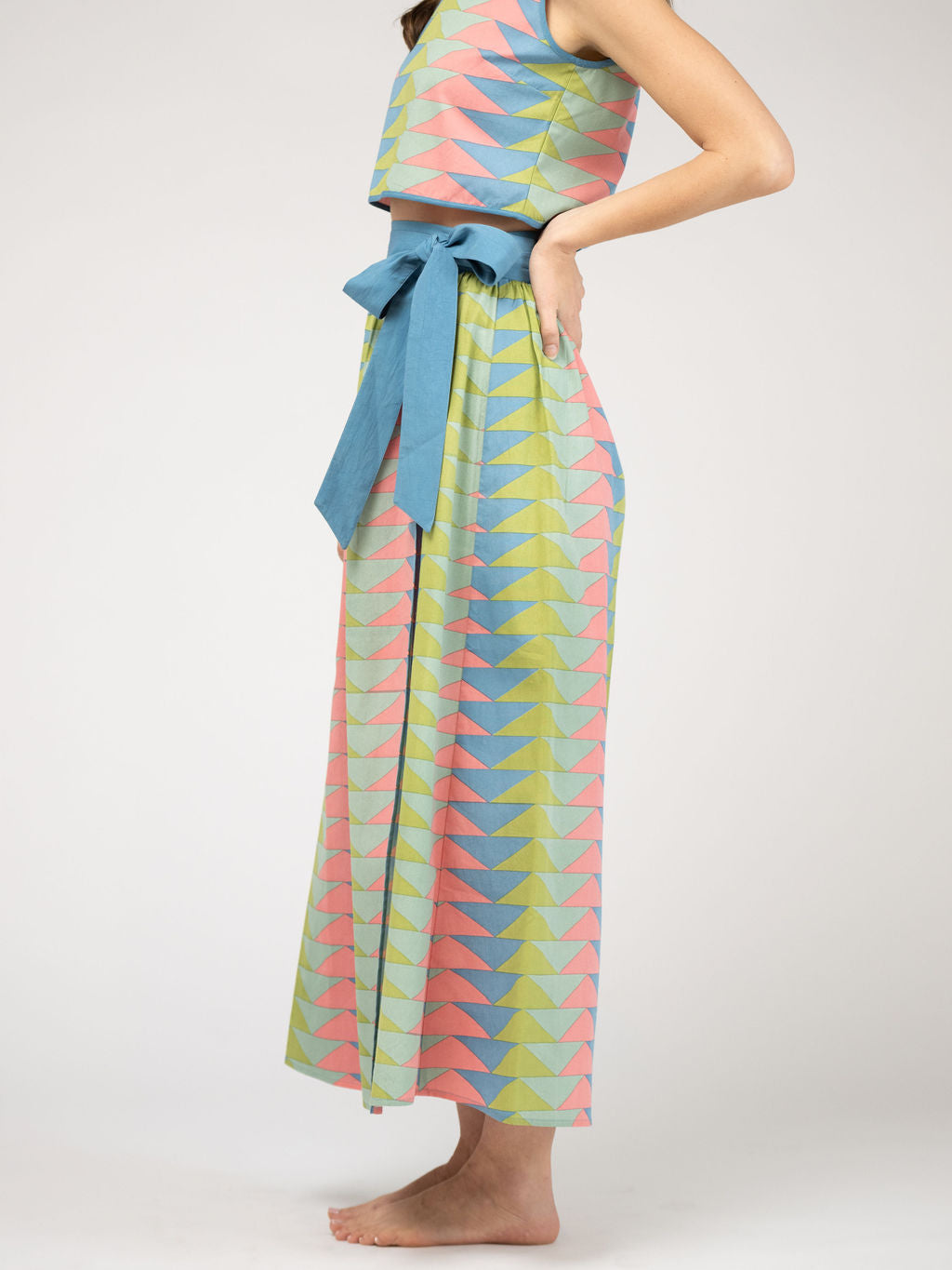 Introducing the Sullivan Skirt in our Rainbow Bagru Triangle. This wrap skirt is the perfect maxi length with an easy fit. Elevate your style while enjoying the comfort and versatility this skirt has to offer.