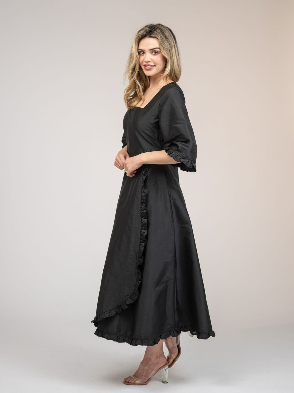 Introducing the Waverly Dress! This playful piece features a flattering square neckline and three quarter sleeves. Made from luxurious taffeta, it's versatile enough for any occasion. Plus, the ruffle details add a fun and flirty touch. Get ready to make a statement.