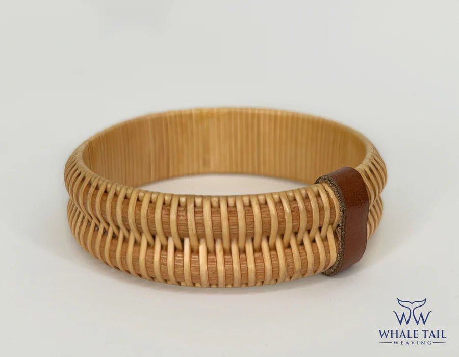 Double strand Nantucket basket bangle. With some weight to it, this one feels substantial, like it was meant to be on your wrist. We take the time and expertise to carefully mold cherry hardwood to create the beautiful Whale Tail Weaving signature contrast between the staves and weavers. Wear it alone or pair with other sized bangles and cuffs!
